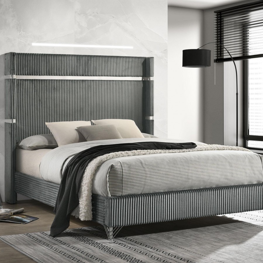 Indulgently soft fabric creates the centerpiece of a modern bed. Its wingback silhouette is timeless and refined, with a low footboard that creates an open, airy look and feel. The tall headboard features stylish bands of gleaming shiny finish trim that create depth and contrast perfectly with the vertical fluted look of the upholstery. At the bottom of the bed, decorative feet feature hairpin-inspired style that brings a retro touch of character to your bedroom. The bed is a charming focal point for your elegant bedroom.