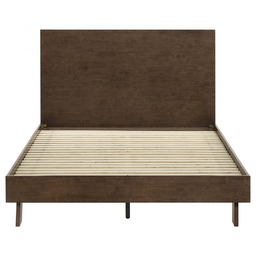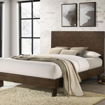 Reimagine a stylish retreat from the world with this modern wooden platform bed at the center of your bedroom. It showcases a panel headboard design with low rails, all in a warm brown finish over solid wood with a subtle grain pattern. The bed features a center rail for added support, creating an inviting sleeping space for guest and primary suites alike. The bed is a clean, straightforward design. Its headboard shows off square corners and a flat panel, perfect for definition without overwhelming surrounding decor.