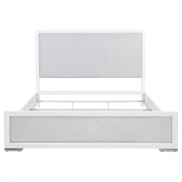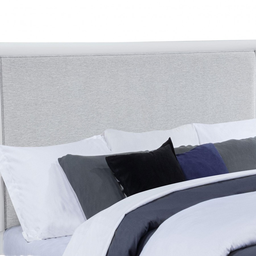 This panel bed pairs crisp framing with soft textures for a look that feels both refined and restful. The panel-style headboard and footboard are upholstered in light grey fabric with subtle herringbone texture, bordered by a clean white frame and finished with brushed nickel feet. Crafted from solid rubberwood, engineered wood, and foam padding, it offers visual contrast and supportive comfort. Foundation required.