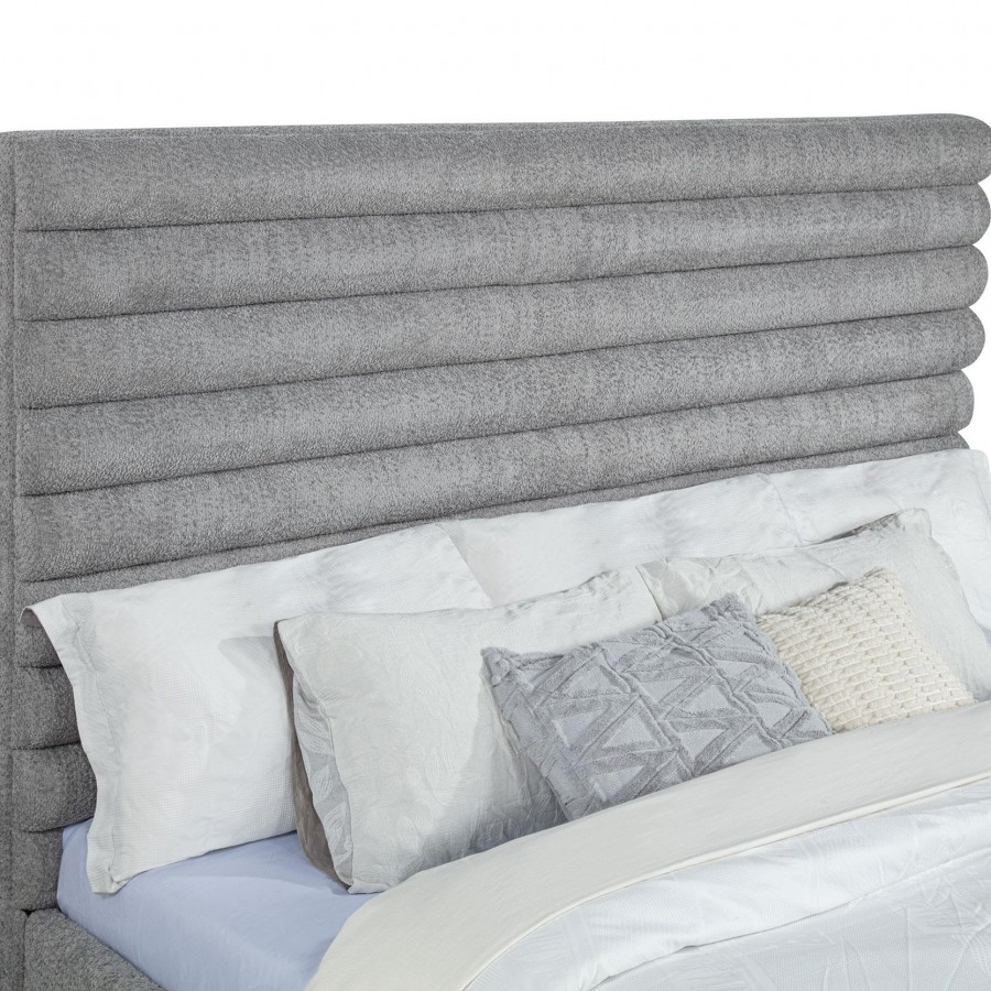 Elevate your bedroom with this modern bed featuring a striking 58-inch tall channel-tufted headboard and matching footboard. Upholstered in soft grey boucle fabric, its textured design creates a cozy and inviting ambiance. Built with durable birch, plywood, and engineered wood, this bed ensures long-lasting support. Foam padding enhances comfort, while black-finished legs provide stability and subtle contrast, making it a perfect statement piece for contemporary spaces.