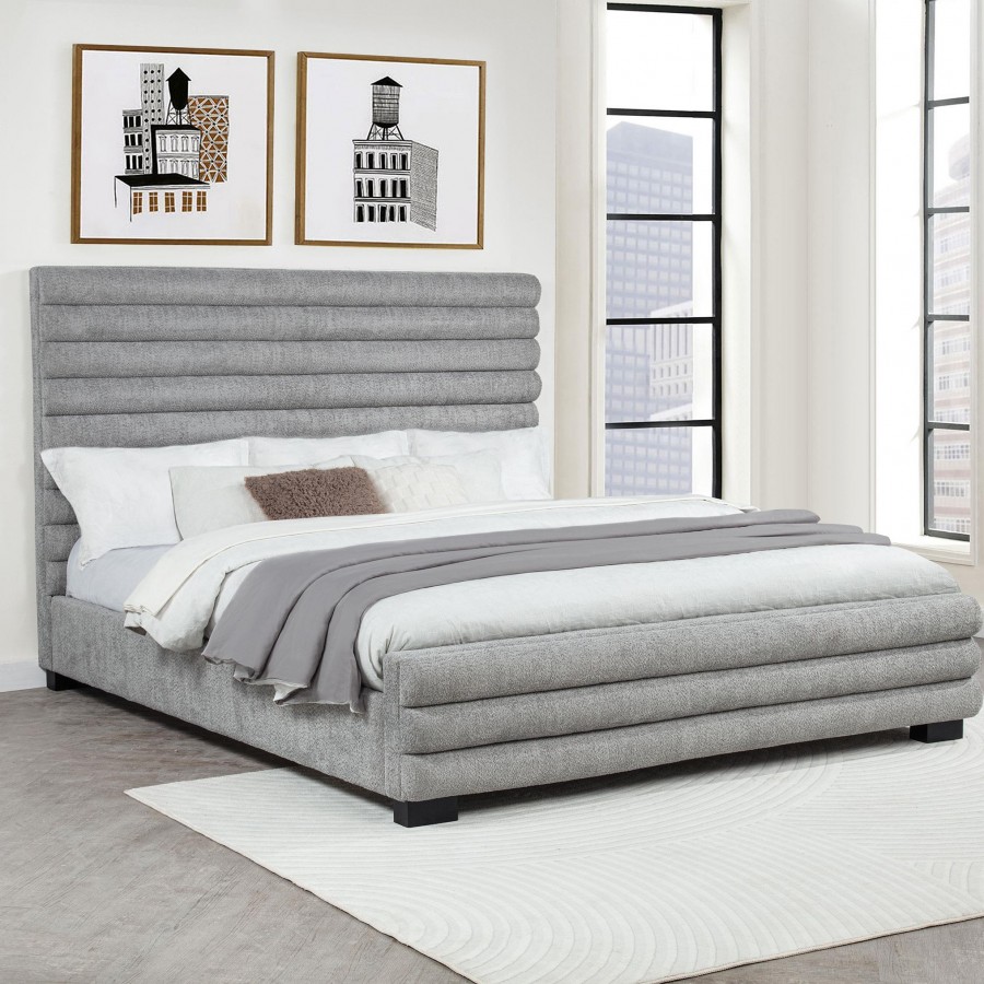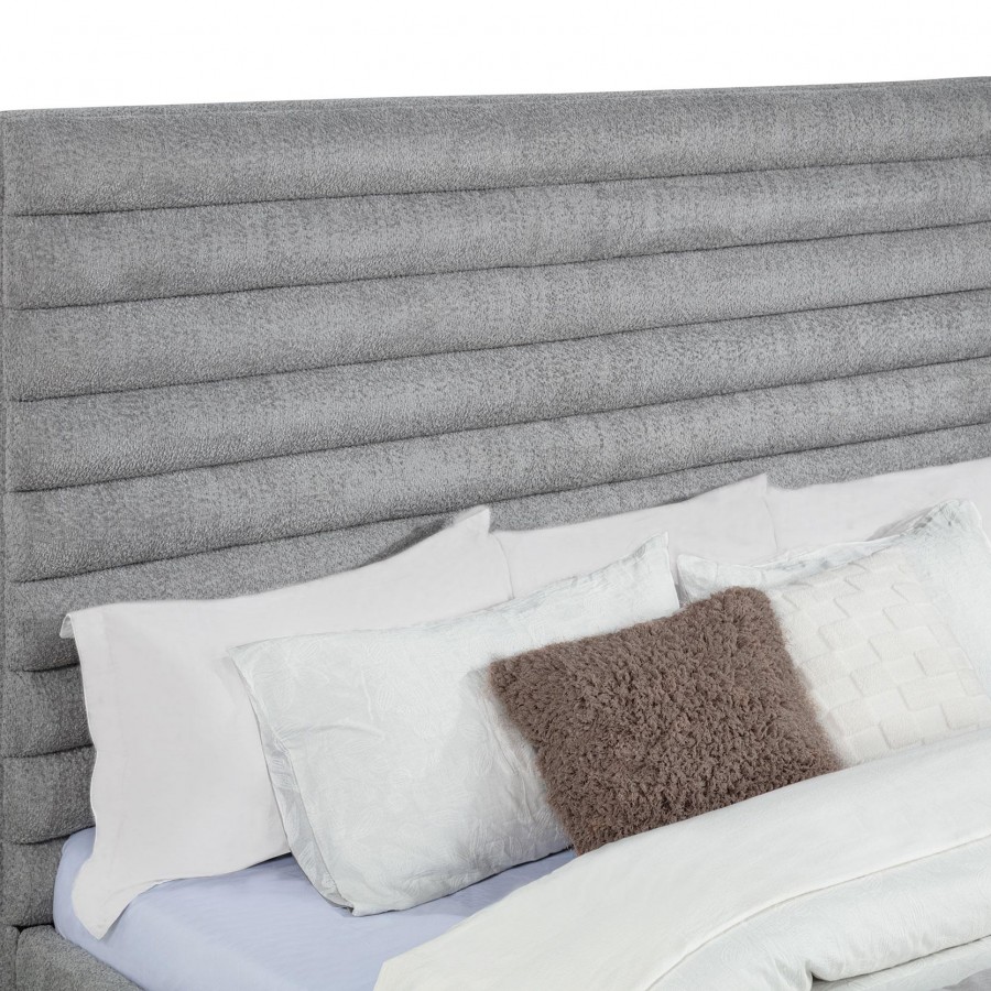 Elevate your bedroom with this modern bed featuring a striking 58-inch tall channel-tufted headboard and matching footboard. Upholstered in soft grey boucle fabric, its textured design creates a cozy and inviting ambiance. Built with durable birch, plywood, and engineered wood, this bed ensures long-lasting support. Foam padding enhances comfort, while black-finished legs provide stability and subtle contrast, making it a perfect statement piece for contemporary spaces.