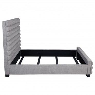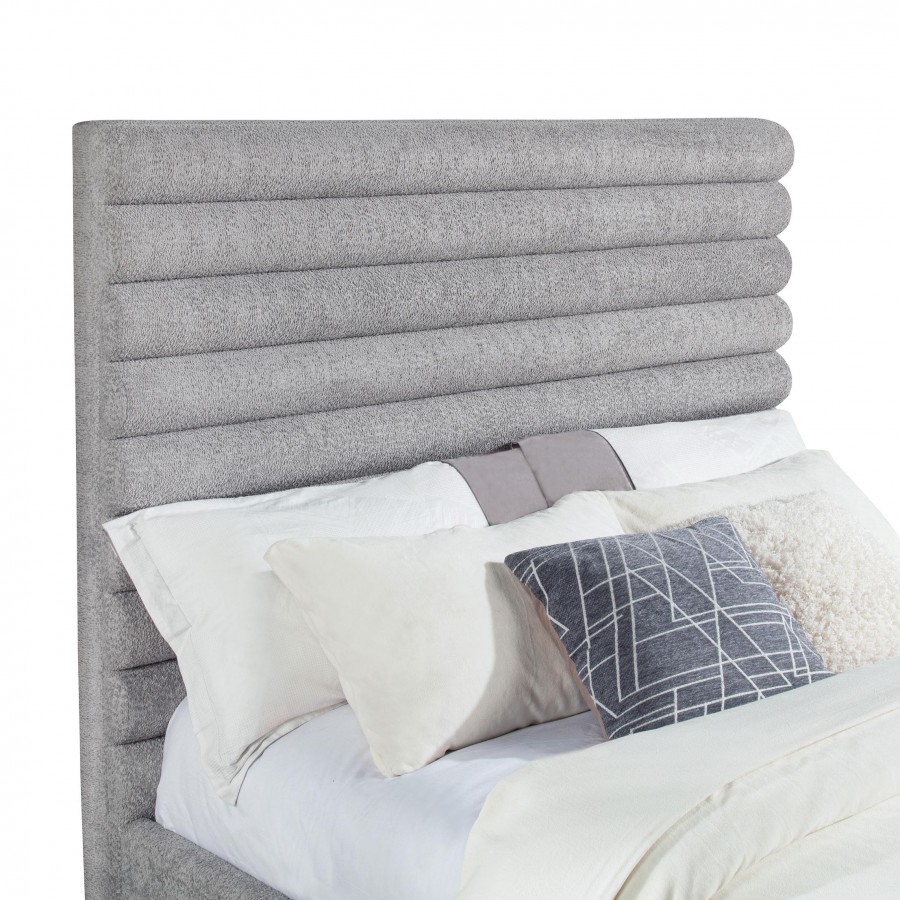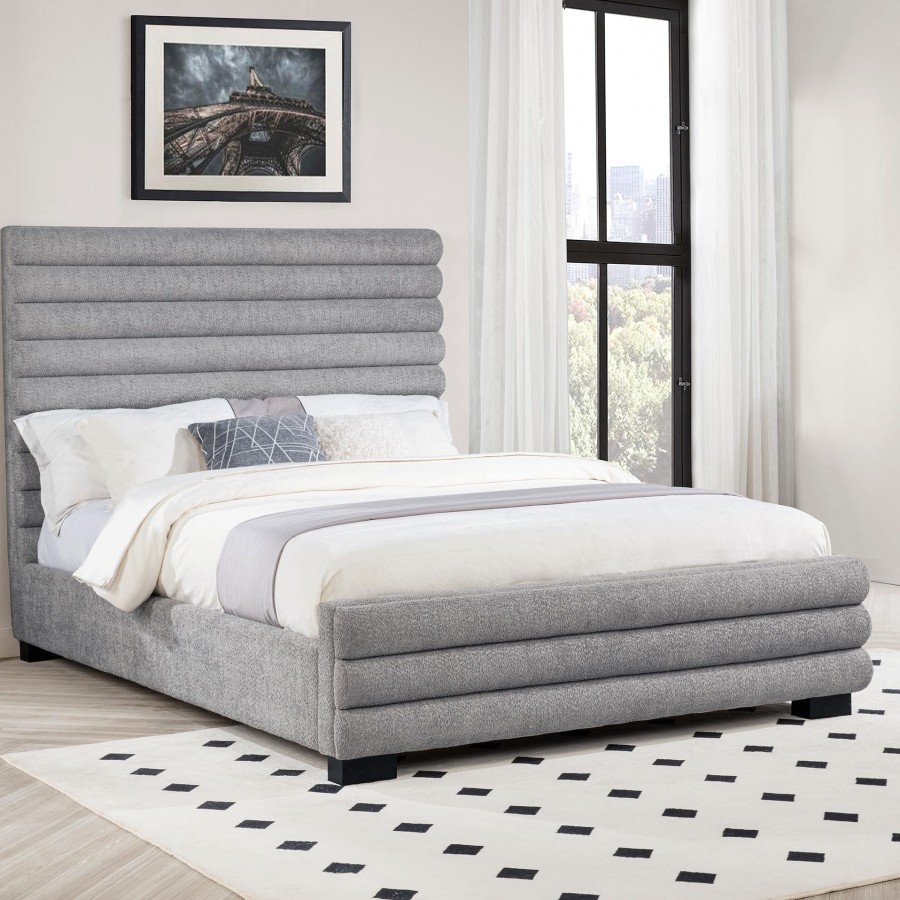 Elevate your bedroom with this modern bed featuring a striking 58-inch tall channel-tufted headboard and matching footboard. Upholstered in soft grey boucle fabric, its textured design creates a cozy and inviting ambiance. Built with durable birch, plywood, and engineered wood, this bed ensures long-lasting support. Foam padding enhances comfort, while black-finished legs provide stability and subtle contrast, making it a perfect statement piece for contemporary spaces.