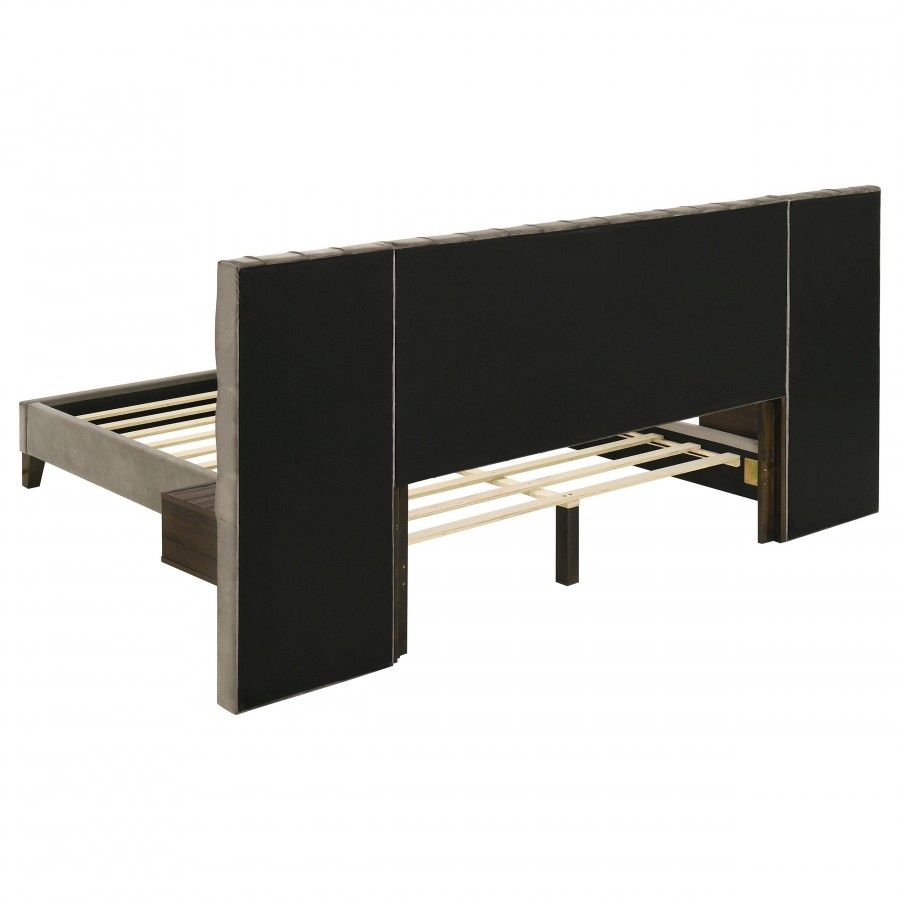 Upgrade to the refined style and inviting sophistication of a modern upholstered bed. Designed to impress while offering a welcoming retreat from the world, the bed features light brown fabric with deep button tufting in a diamond pattern that creates wonderful texture and dimension. The three-panel design includes floating nightstands, ensuring bedside storage while maintaining a light, airy ambiance in your bedroom. The nightstands are open cubes, each in a rich brown finish with a wood look, perfectly complementing the silhouette of the bed. Classic upholstered rails complete the look while tapering legs ensure support and stability.