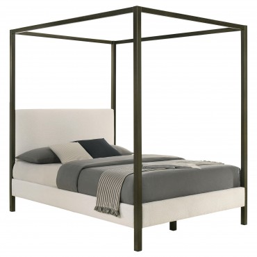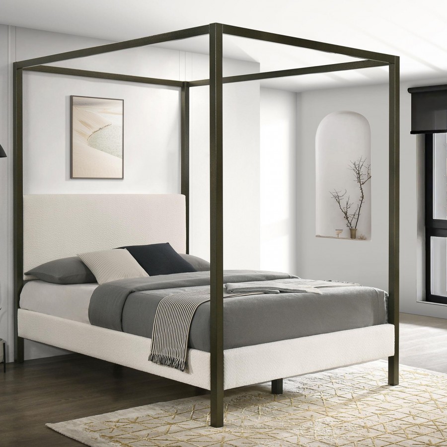 Bring refined style and character to your bedroom with this contemporary canopy bed. Designed as an instant focal point, it features a clean-lined silhouette with a padded headboard and rails upholstered in soft vanilla boucle fabric for a warm, inviting touch. A four-post metal frame in a bronze powder-coated finish adds height and depth, seamlessly blending modern and traditional elements. The platform bed includes wooden slats and three center support legs, ensuring lasting strength and stability for restful nights.
