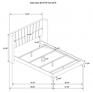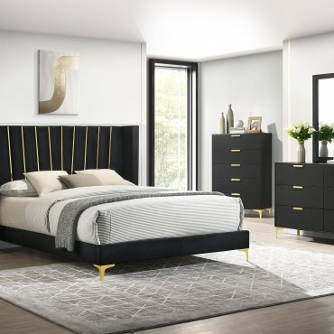 Steeped in glamour, this modern upholstered bed pairs a lush look with a wingback headboard silhouette that evokes timeless character. Black upholstery is soft and rich, with a tall headboard profile that creates a chic focal point for surrounding decor. Golden rays decorate the headboard, adding verticality and gleaming contrast for a chic, refined touch of elegance. Padding add impeccable comfort for lounging and reading in bed while additional support legs add stability to the center of the bed. Style the bed with gorgeous linens to complete your sophisticated bedroom.
