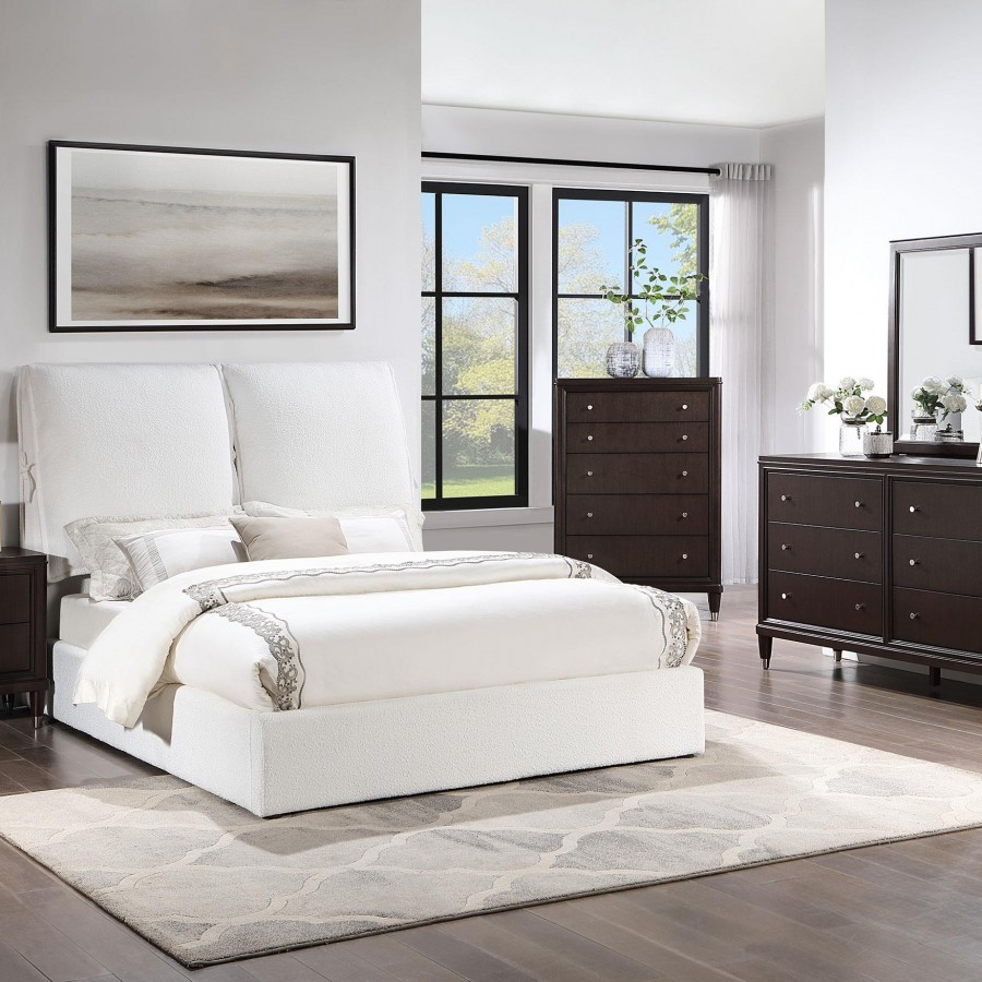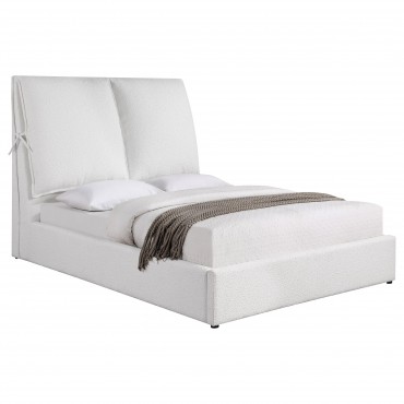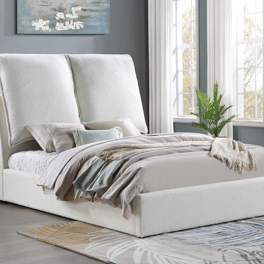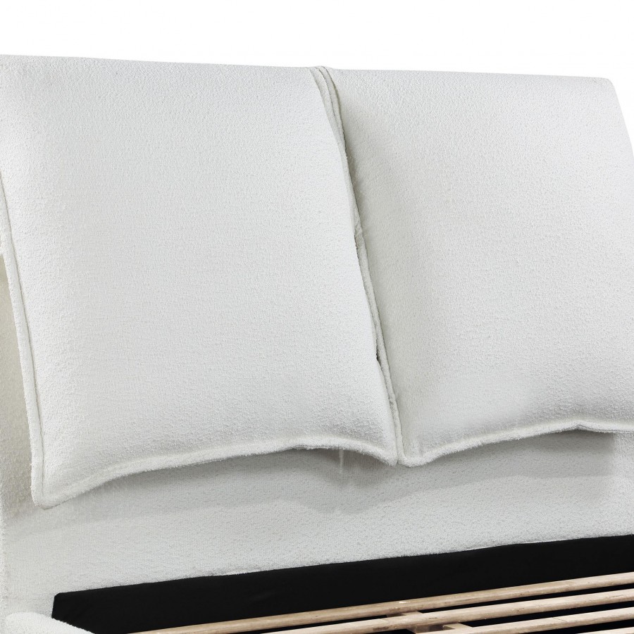 Get cozy with this plush upholstered bed, featuring trendy and soft boucle fabric that fully covers the frame. Two extra-large pillows attached with tie-offs add comfort and aesthetic appeal. Its sophisticated texture looks amazing from across the room, while the perfect headboard allows for comfortable sitting and enjoyment of various activities. The frame is expertly crafted for durability and reliability.