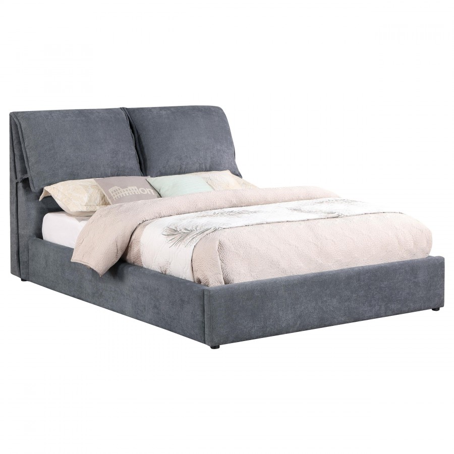 Experience the sophistication of our upholstered bed, harmoniously blending clean lines and an understated silhouette to accentuate organic simplicity. The plush headboard, featuring two oversized pillows secured with tie-offs, provides an inviting space to sit up in bed. Wrapped in a cozy charcoal grey fabric, the elegant side rails and footboard complete the refined aesthetic.