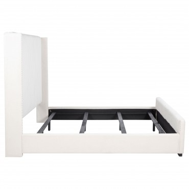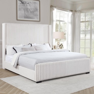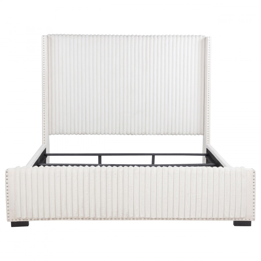 Instill luscious decadence with a modern glam upholstered bed. Cream fabric over plush foam cushioning creates a lush look and impeccable comfort when lounging. The bed is defined with its tall, wingback headboard, which boasts vertical channel tufting for the perfect hint of texture and depth. Nailhead trim traces the clean, straight lines of its silhouette, with a matching low footboard to complete the look. Choose white linens for a monochrome effect, or opt for vibrant colors to create a truly showstopping effect in your bedroom.