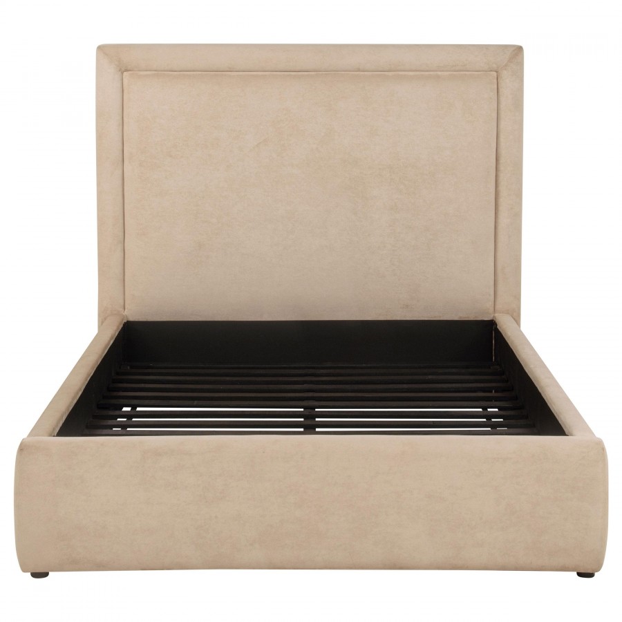 Clean lines and understated elegance define this platform bed, wrapped in smooth upholstery from base to headboard. The simple panel design offers a tailored profile, softened by subtle padding and low foot rails for an inviting finish. With a fully slatted foundation, this bed supports a mattress directly, no box spring needed. Perfect for modern minimalists or transitional spaces, it balances comfort and clarity in a sleek, grounded silhouette.