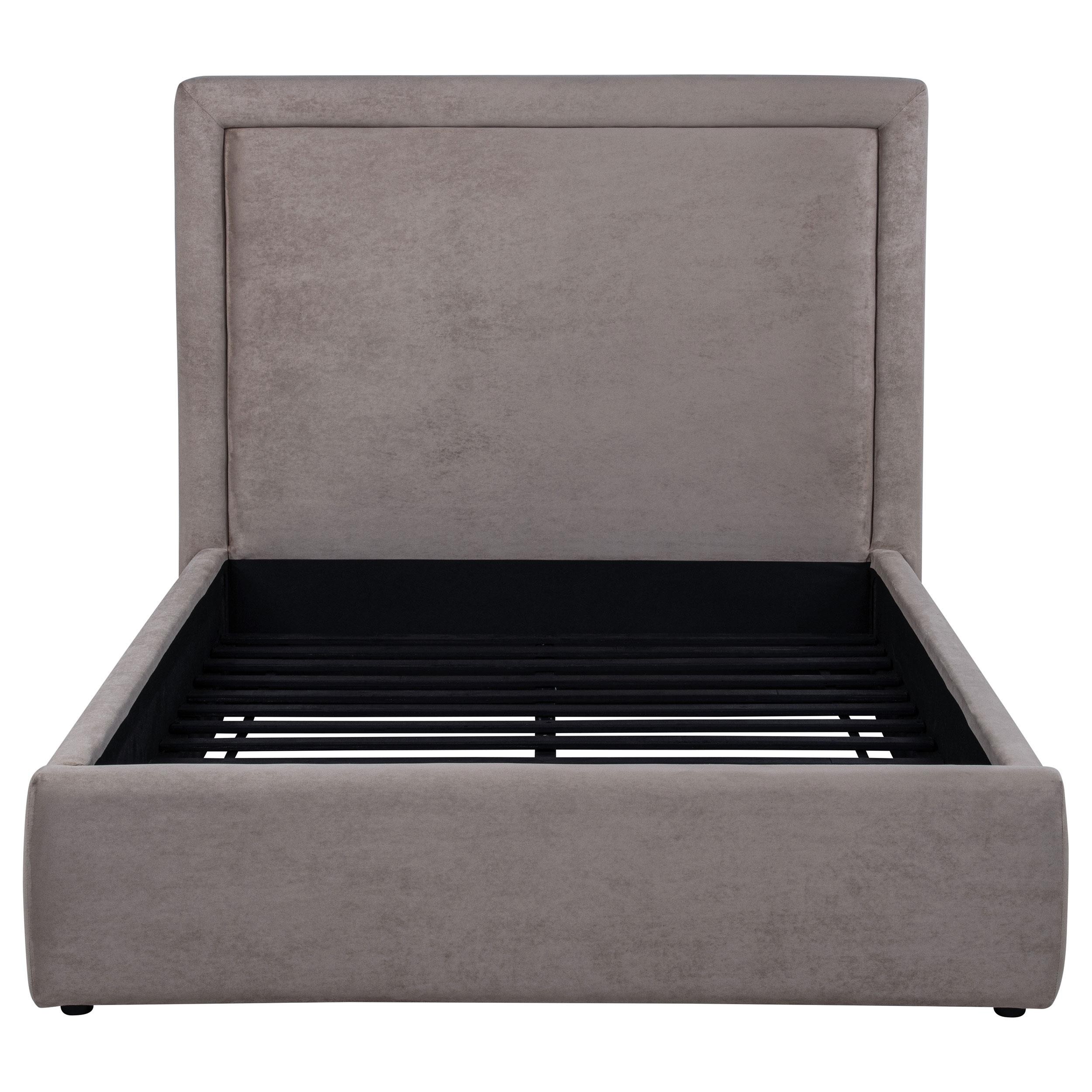 Clean lines and understated elegance define this platform bed, wrapped in smooth upholstery from base to headboard. The simple panel design offers a tailored profile, softened by subtle padding and low foot rails for an inviting finish. With a fully slatted foundation, this bed supports a mattress directly, no box spring needed. Perfect for modern minimalists or transitional spaces, it balances comfort and clarity in a sleek, grounded silhouette.