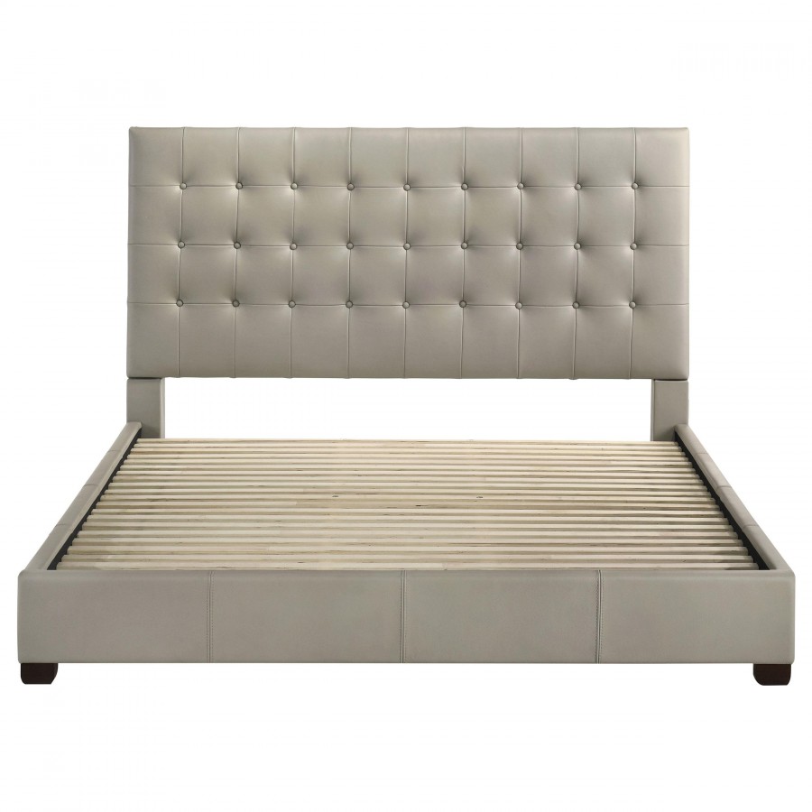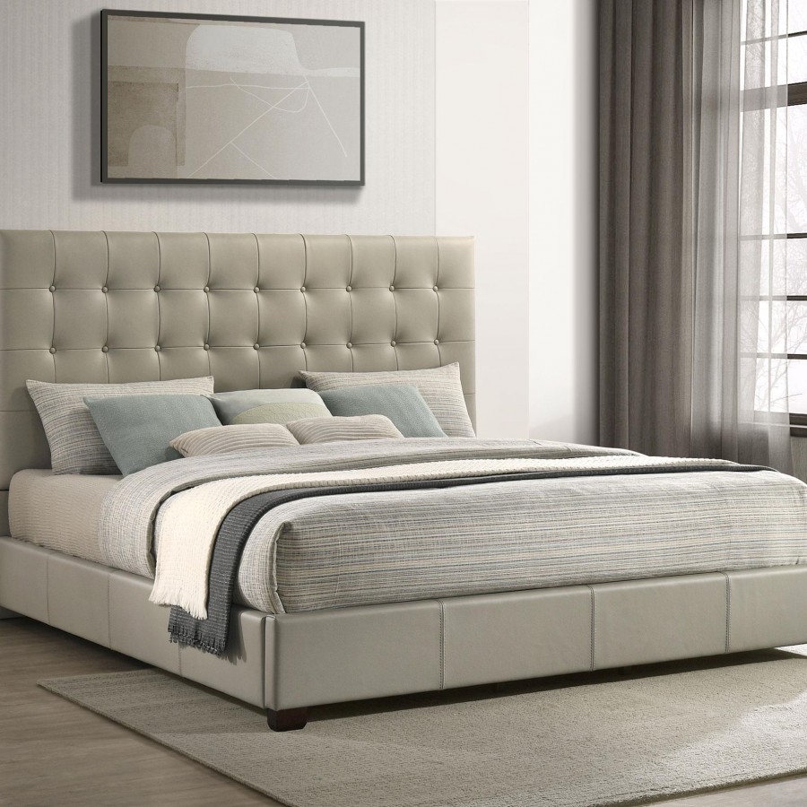 Striking the perfect balance between elegance and edge, this platform bed brings sculptural calm to the modern bedroom. A tall, grid-tufted headboard offers visual rhythm and tailored softness, while smooth, low-profile rails wrap the frame in sleek refinement. Fully upholstered in genuine leather and supported by a built-in slat system, it provides lasting comfort without the need for a foundation—crafted to anchor the room with quiet confidence and bold presence.