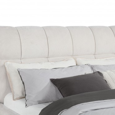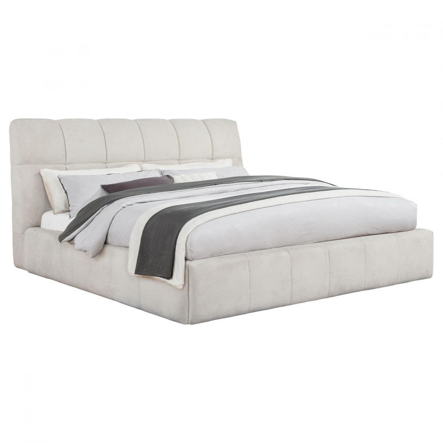 Tailored with bold lines and soft texture, this upholstered platform bed blends comfort with quiet strength. Vertical channel tufting runs along the headboard and foot rails, adding dimension and rhythm to the silhouette. Wrapped in plush fabric and fully slatted for support, it eliminates the need for a foundation. Crafted from solid and engineered wood, this bed invites modern serenity into any bedroom retreat.