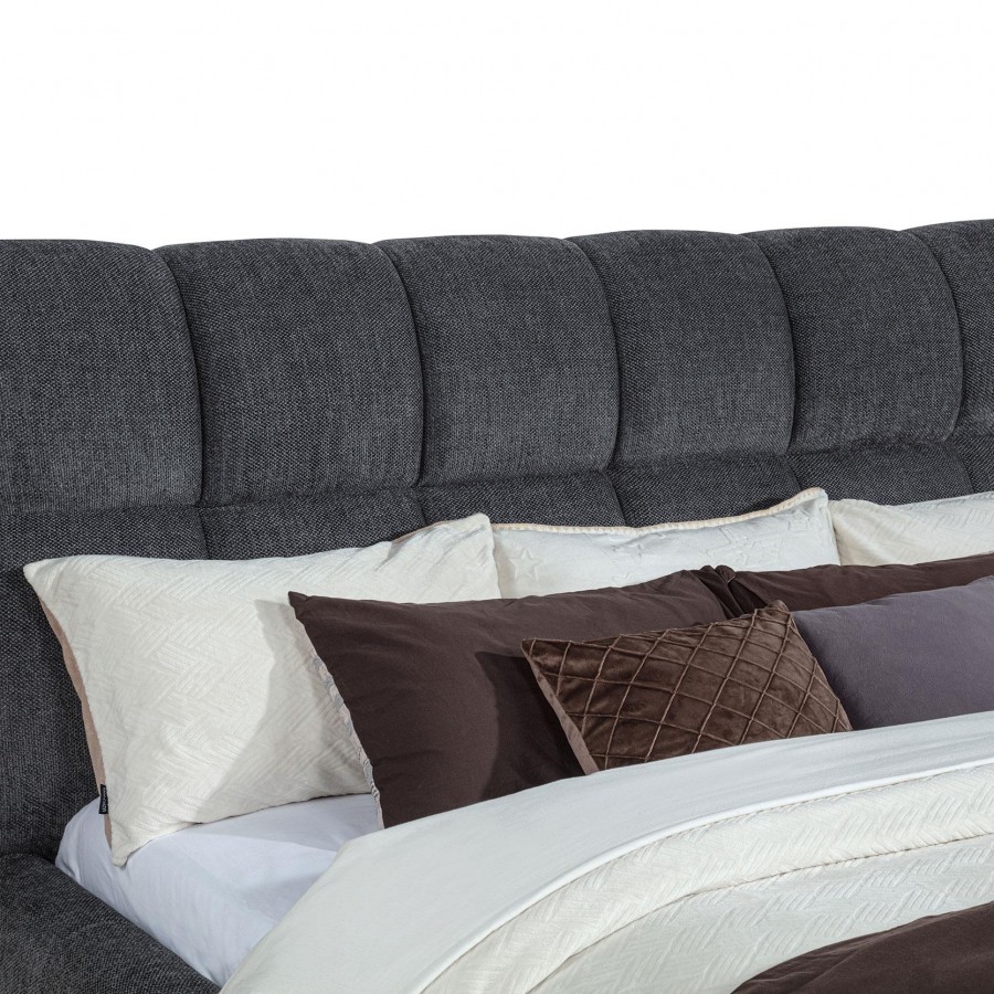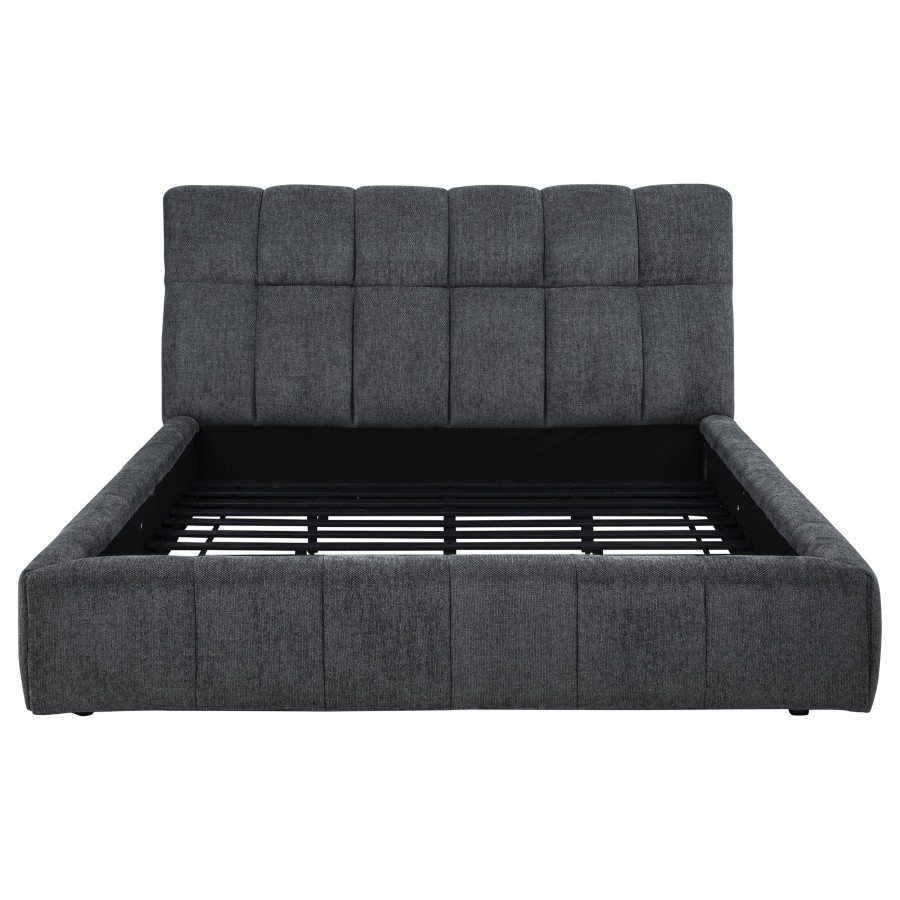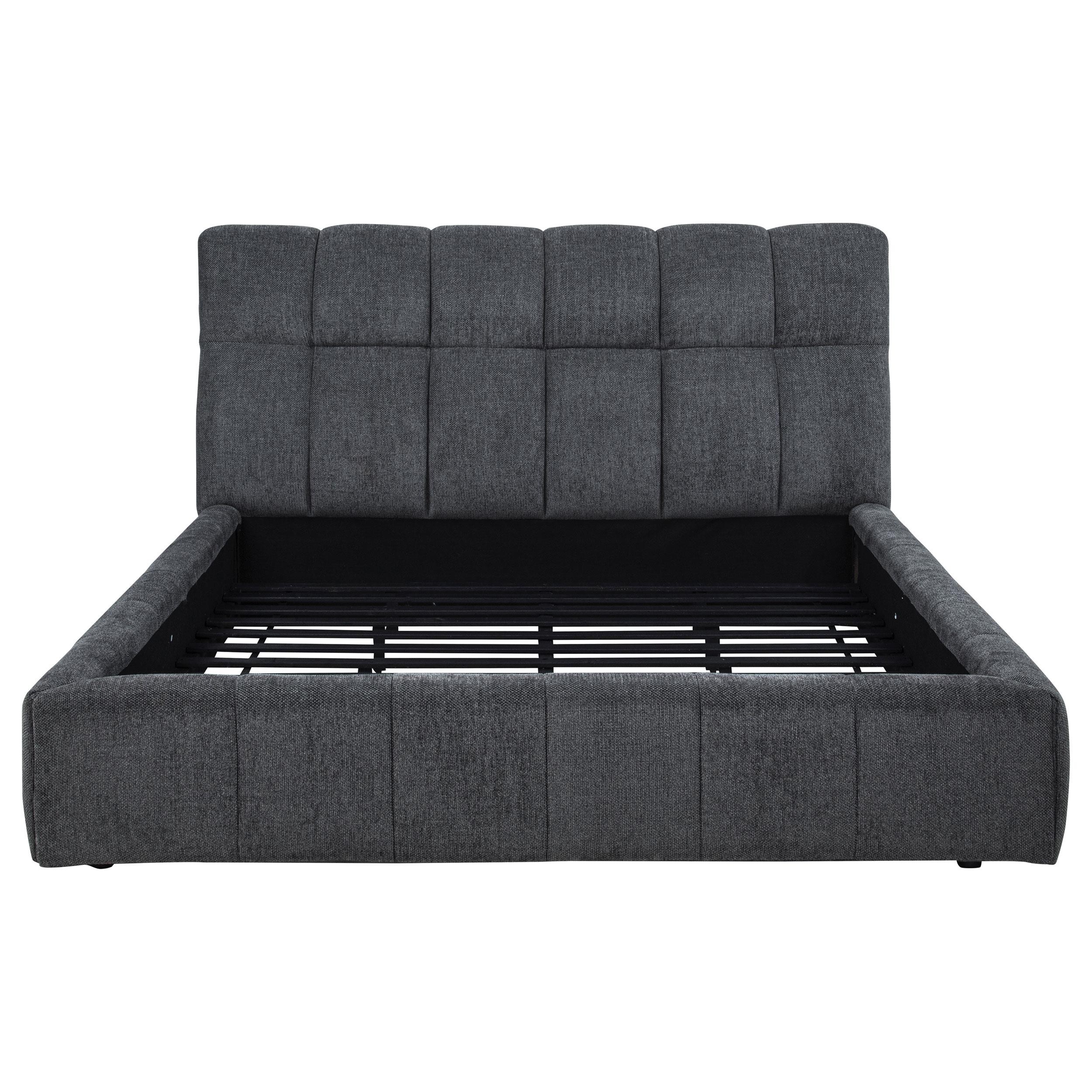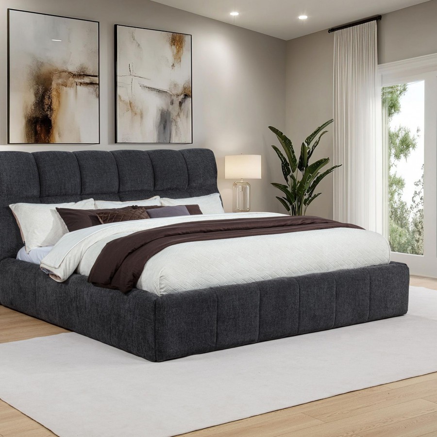 Tailored with bold lines and soft texture, this upholstered platform bed blends comfort with quiet strength. Vertical channel tufting runs along the headboard and foot rails, adding dimension and rhythm to the silhouette. Wrapped in plush fabric and fully slatted for support, it eliminates the need for a foundation. Crafted from solid and engineered wood, this bed invites modern serenity into any bedroom retreat.