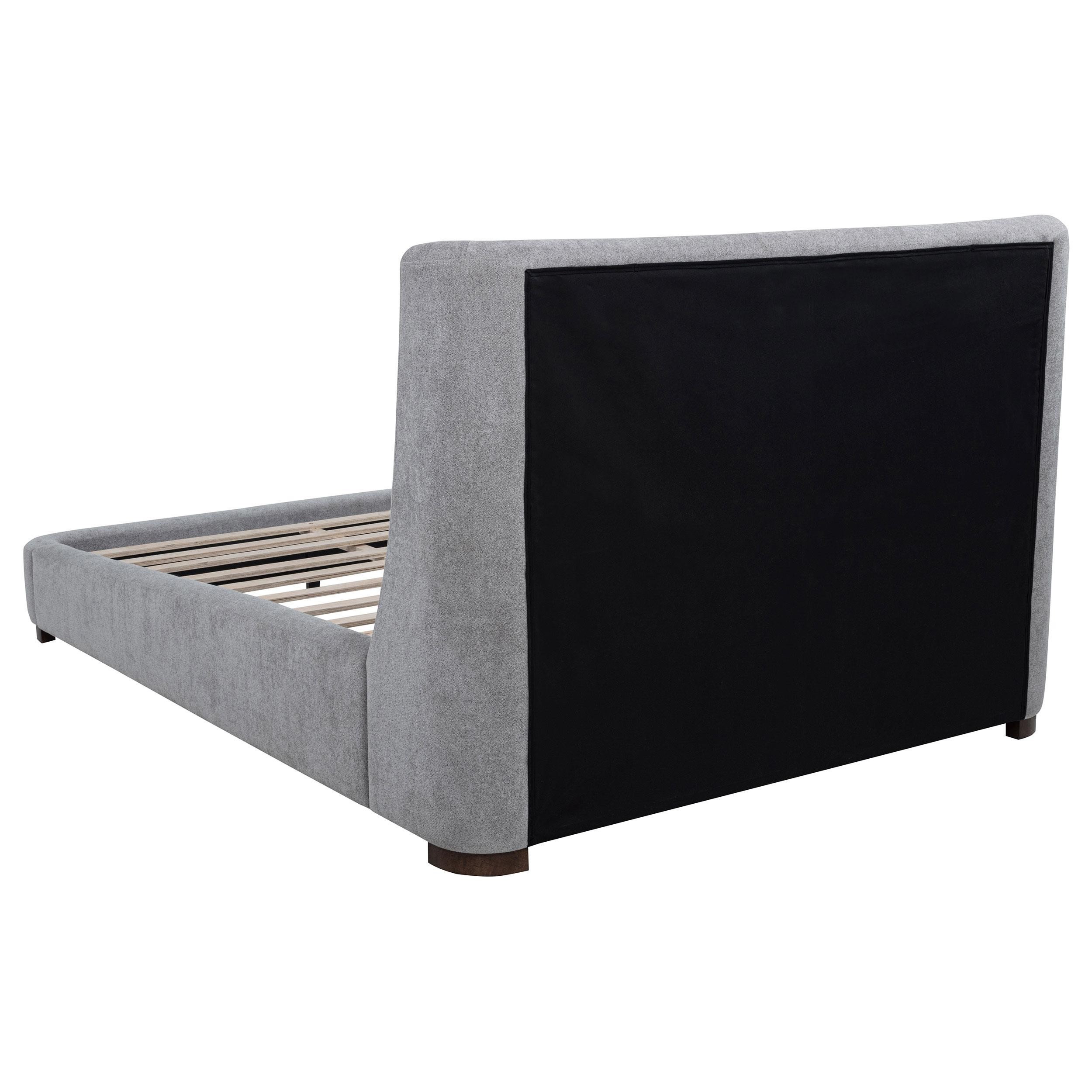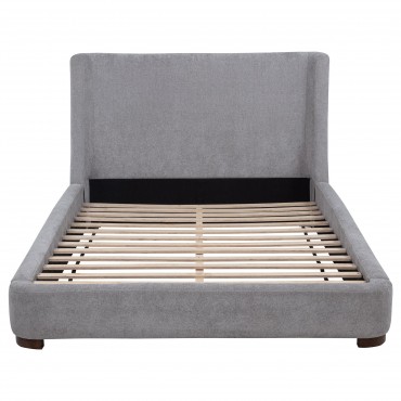 A study in soft curves and refined restraint, this upholstered platform bed brings sculptural poise to any bedroom. The wingback headboard wraps gently around the sleep space, offering both visual embrace and quiet shelter. Upholstered in textured grey fabric and supported by rich walnut-toned legs, it pairs warm contrast with tailored softness. Designed with built-in slats, this platform bed offers strong support without the need for a foundation.