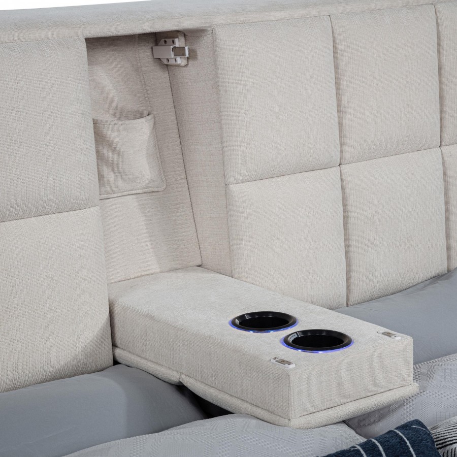This innovative platform bed transforms the modern bedroom with bold style and hidden functionality. The oversized, square-tufted headboard conceals flip-up LED reading lights on each end and a drop-down center console with dual cup holders and storage for essentials. Wide side rails and a fully wrapped footboard offer sit-on ledges, while a supportive slatted platform eliminates the need for a foundation. Thoughtfully engineered and rich in features, this “Transformer Bed” redefines everyday comfort.