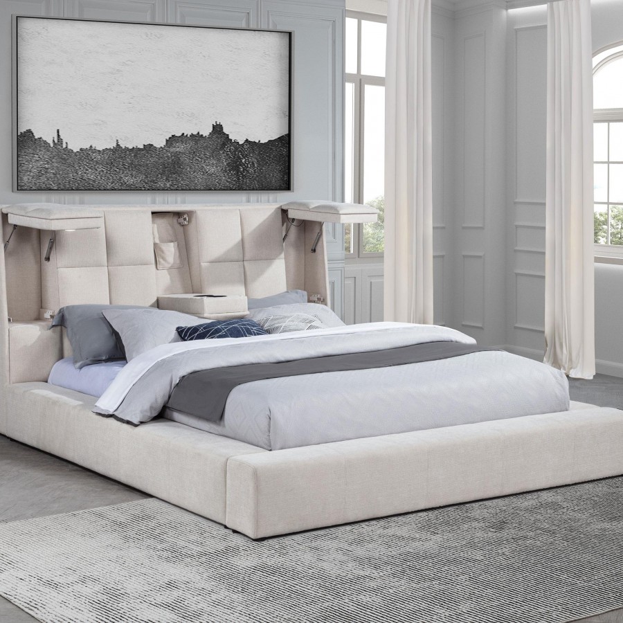 This innovative platform bed transforms the modern bedroom with bold style and hidden functionality. The oversized, square-tufted headboard conceals flip-up LED reading lights on each end and a drop-down center console with dual cup holders and storage for essentials. Wide side rails and a fully wrapped footboard offer sit-on ledges, while a supportive slatted platform eliminates the need for a foundation. Thoughtfully engineered and rich in features, this “Transformer Bed” redefines everyday comfort.
