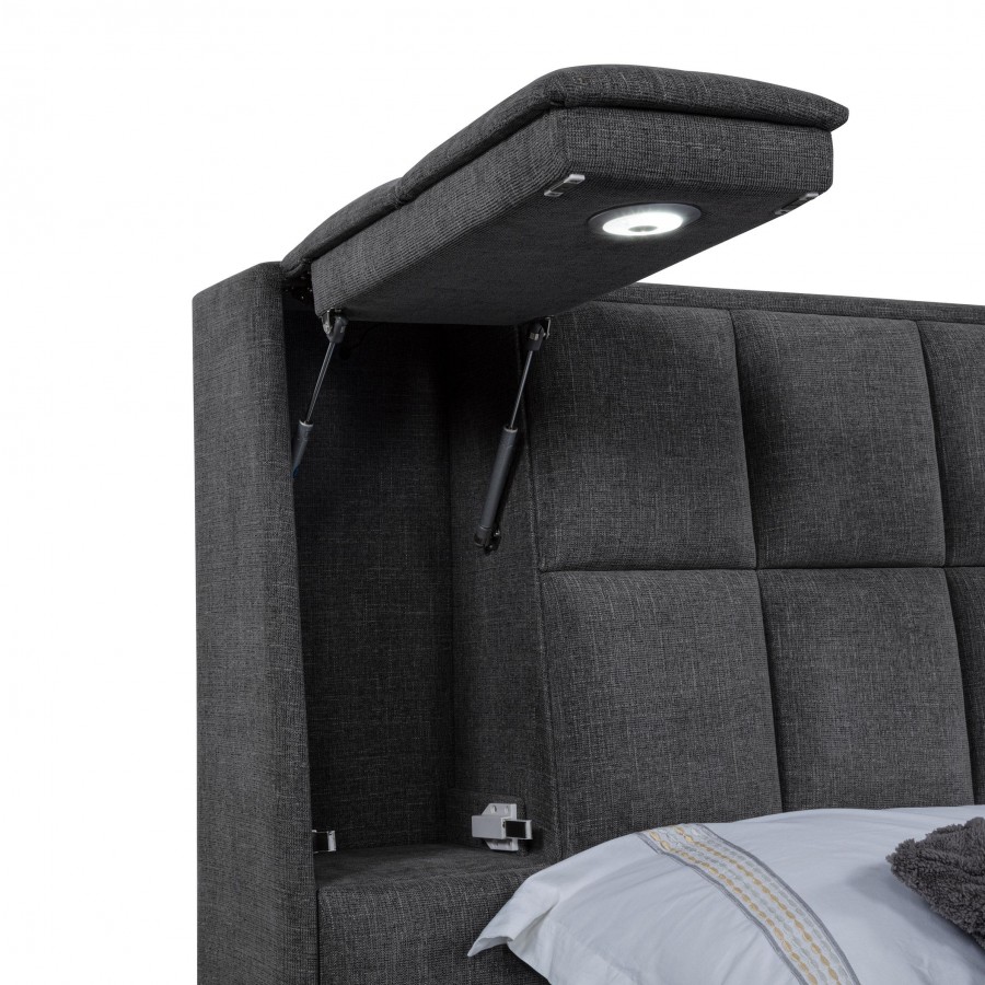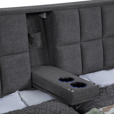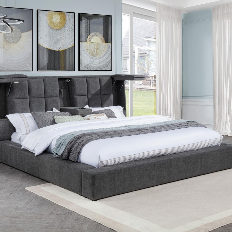 This innovative platform bed transforms the modern bedroom with bold style and hidden functionality. The oversized, square-tufted headboard conceals flip-up LED reading lights on each end and a drop-down center console with dual cup holders and storage for essentials. Wide side rails and a fully wrapped footboard offer sit-on ledges, while a supportive slatted platform eliminates the need for a foundation. Thoughtfully engineered and rich in features, this “Transformer Bed” redefines everyday comfort.