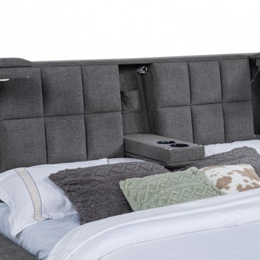 This innovative platform bed transforms the modern bedroom with bold style and hidden functionality. The oversized, square-tufted headboard conceals flip-up LED reading lights on each end and a drop-down center console with dual cup holders and storage for essentials. Wide side rails and a fully wrapped footboard offer sit-on ledges, while a supportive slatted platform eliminates the need for a foundation. Thoughtfully engineered and rich in features, this “Transformer Bed” redefines everyday comfort.