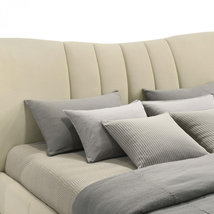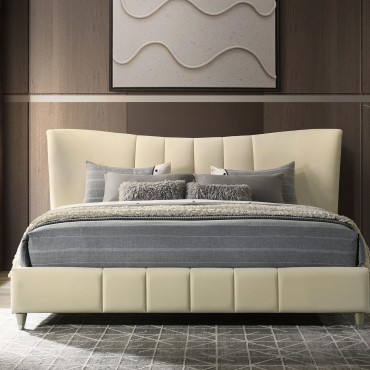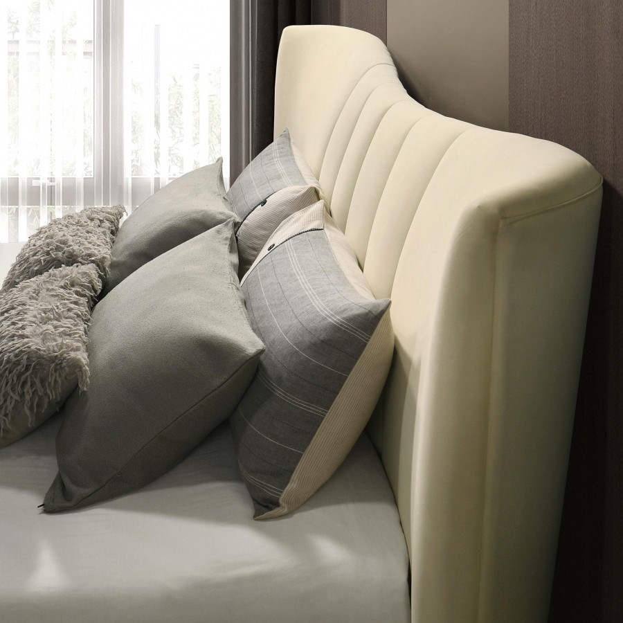 Elegance unfolds in every curve of this platform bed, where tailored details and graceful lines create a haven of serenity. Wrapped in ivory velvet, the subtly contoured headboard and pleated footboard introduce softness with sculptural poise. Polished gold legs lend a hint of glamour beneath the upholstered frame. Built with a fully slatted platform, it offers lasting support without the need for a foundation—an exquisite balance of beauty, comfort, and simplicity.