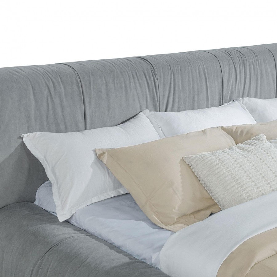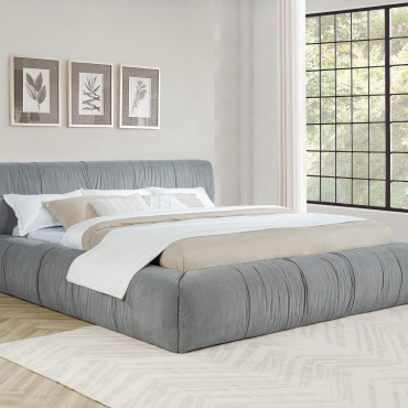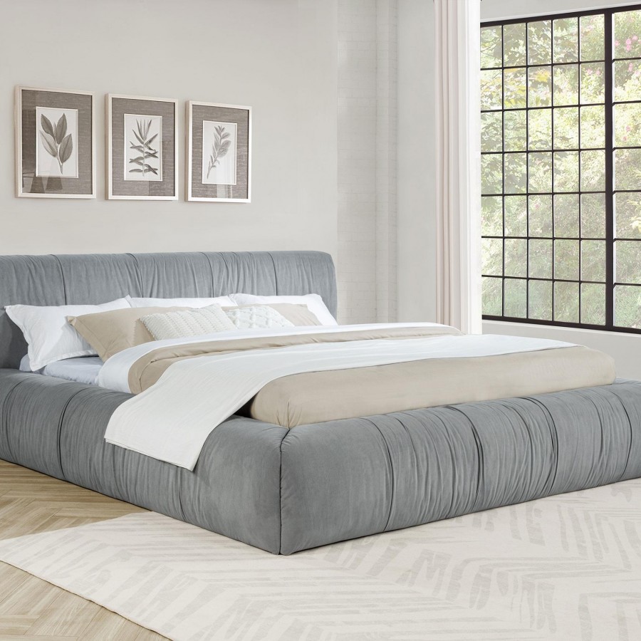 Thick, indulgent cushioning creates a refined but inviting ambiance for this modern upholstered bed. Its a low-slung silhouette that creates a true retreat from the word, with plush foam and soft dove gray fabric upholstery that showcases gentle, organic pleating to create a lived-in look and feel. The bed features a thick, low headboard wonderful for lounging, and pairs it with wide rails and a matching footboard. A recessed platform hosts the mattress of your choice (not included) and creates a cozy and inviting spot for rest and relaxation. It's the perfect centerpiece for an indulgent, contemporary bedroom.