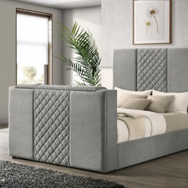 This bed is where elegance meets indulgence, inviting you to unwind in a world of luxury and innovation. A quilted velvet headboard adds a soft, sculptural presence, while the footboard conceals a motorized TV lift that glides open with a wireless remote. Designed to cradle screens up to fifty inches, it includes a discreet power outlet for seamless connectivity. Wrapped in plush velvet and framed in foam-padded wood, this bed redefines rest with a whisper of modern romance.