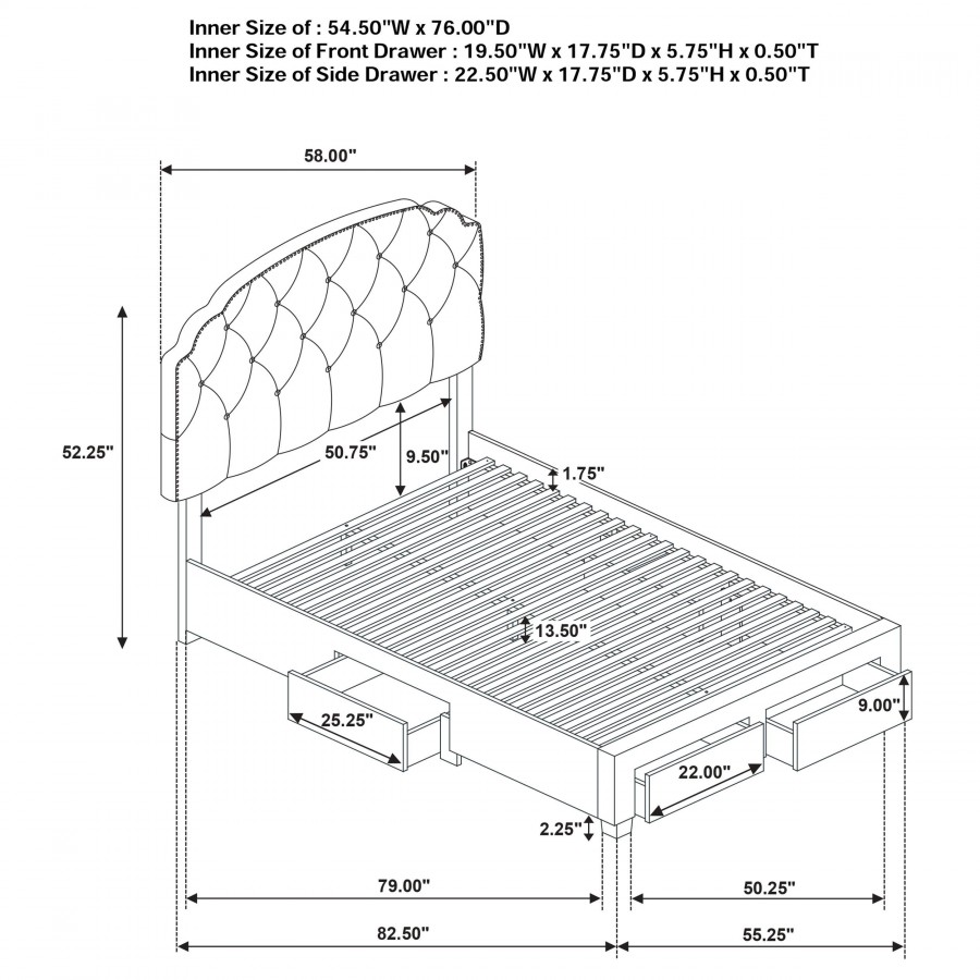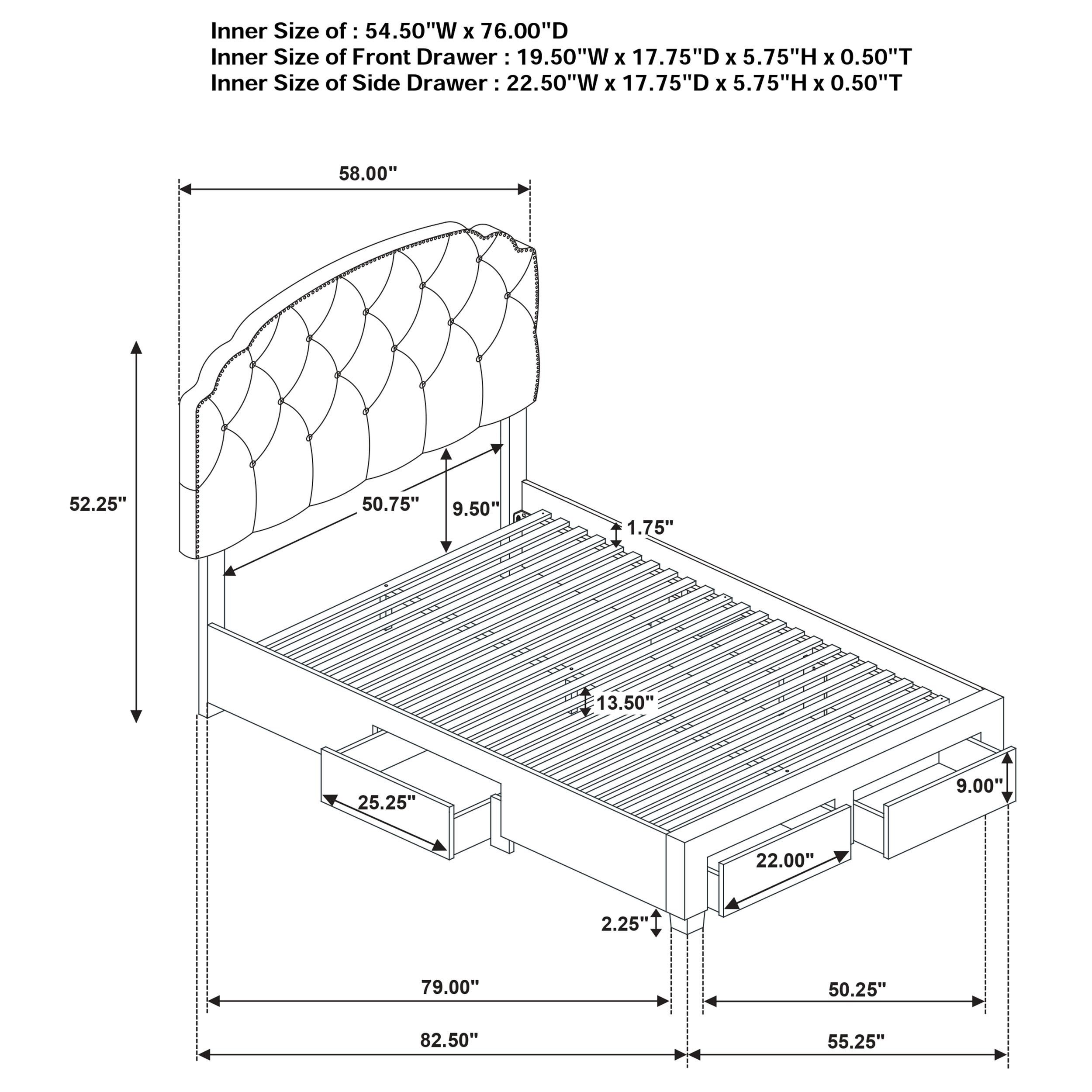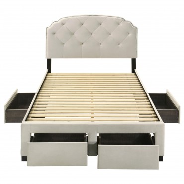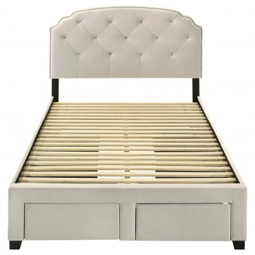 Indulge in comfort and utility with this platform storage bed, where graceful design meets everyday practicality. A tufted velvet headboard with gentle curves and nailhead trim brings refined elegance, while four built-in drawers offer generous hidden storage. Expertly crafted from rubberwood, engineered wood, and foam, this fully slatted frame eliminates the need for a foundation. It's a sophisticated solution for streamlined, serene living.