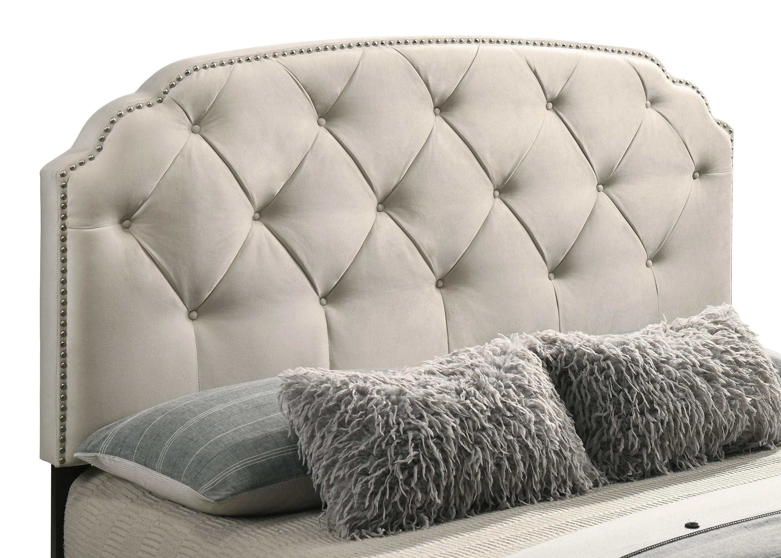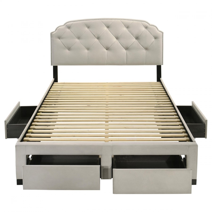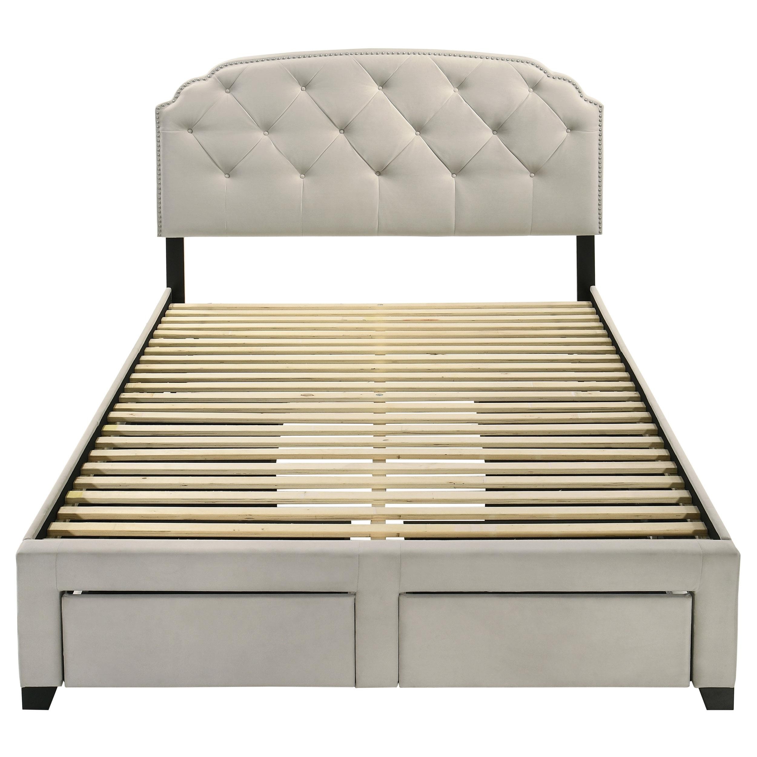 Indulge in comfort and utility with this platform storage bed, where graceful design meets everyday practicality. A tufted velvet headboard with gentle curves and nailhead trim brings refined elegance, while four built-in drawers offer generous hidden storage. Expertly crafted from rubberwood, engineered wood, and foam, this fully slatted frame eliminates the need for a foundation. It's a sophisticated solution for streamlined, serene living.