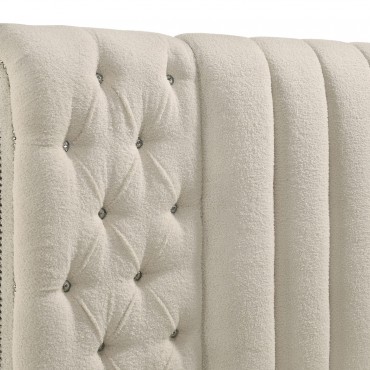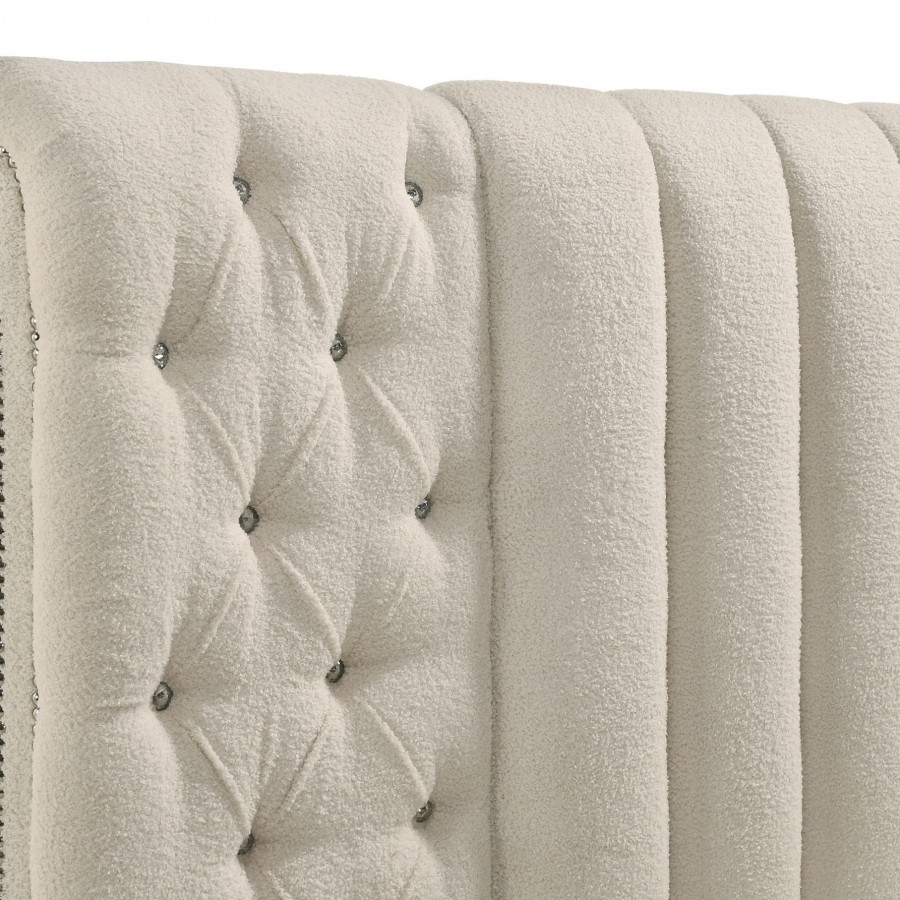Make a bold statement in your bedroom with this luxurious round-bench bed, designed to elevate your space into a glamorous retreat. The elegant ivory bouclé fabric features exquisite channeled tufting, adorned with sparkling acrylic buttons that shimmer with every glance. Adding to the functionality, USB charging ports are conveniently located on both sides of the headboard, allowing you to stay connected without leaving the comfort of your bed. The design brings a unique blend of modern luxury and timeless elegance, perfect for creating a dramatic yet cozy atmosphere.