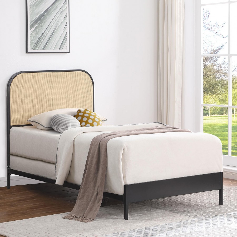 Introduce a touch of contemporary charm to your bedroom with this elegantly designed bed. Crafted with a heavy gauge steel frame, it offers robust durability while maintaining a sleek aesthetic. The headboard features woven radio weave cane webbing, made from sustainable polyethylene rattan, providing both a stylish and eco-friendly choice. This bed seamlessly combines modern materials and traditional weaving techniques, creating a unique focal point for your space. Perfect for those seeking a blend of durability, style, and sustainability in their home decor.