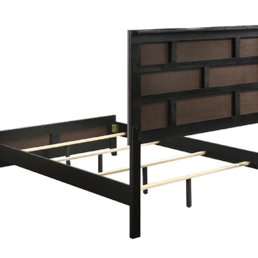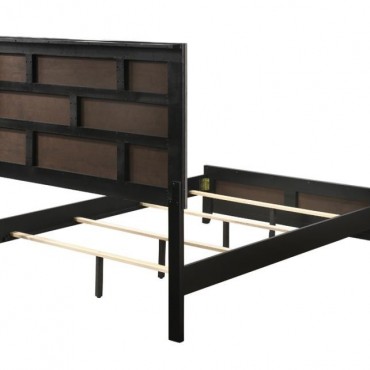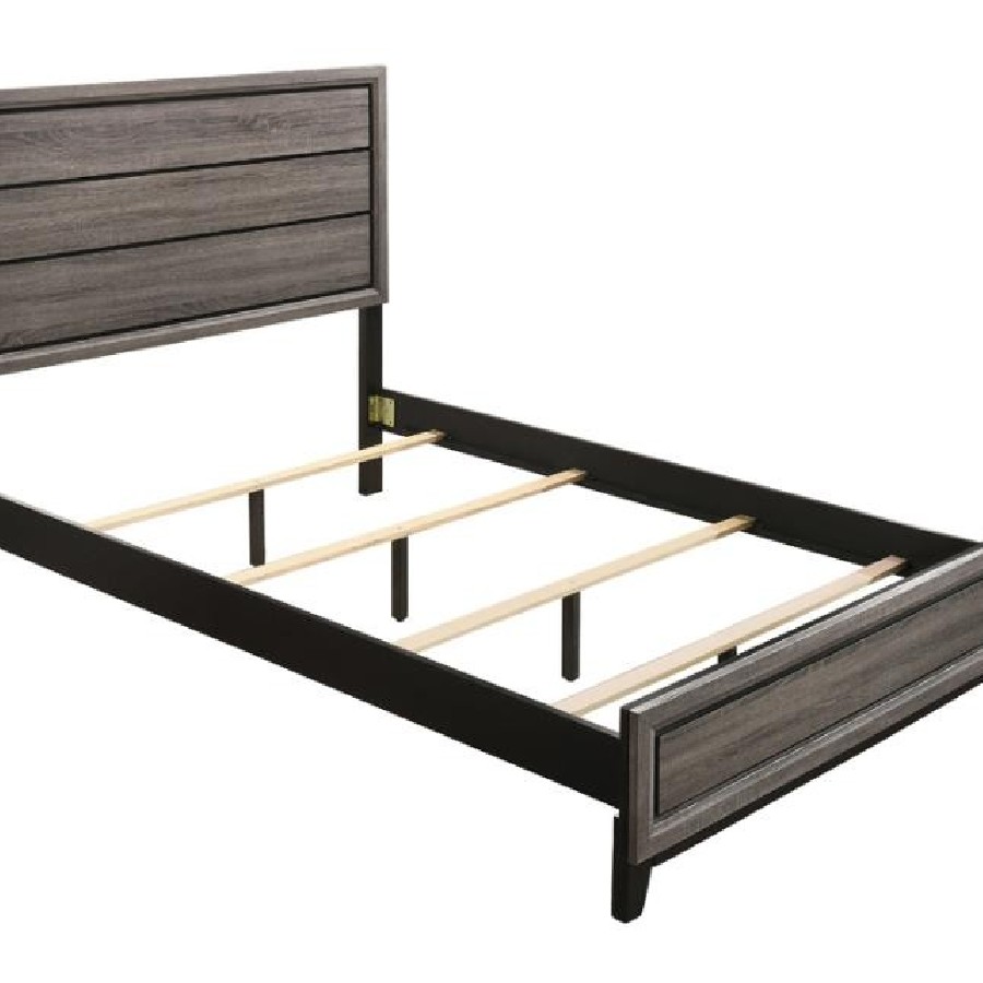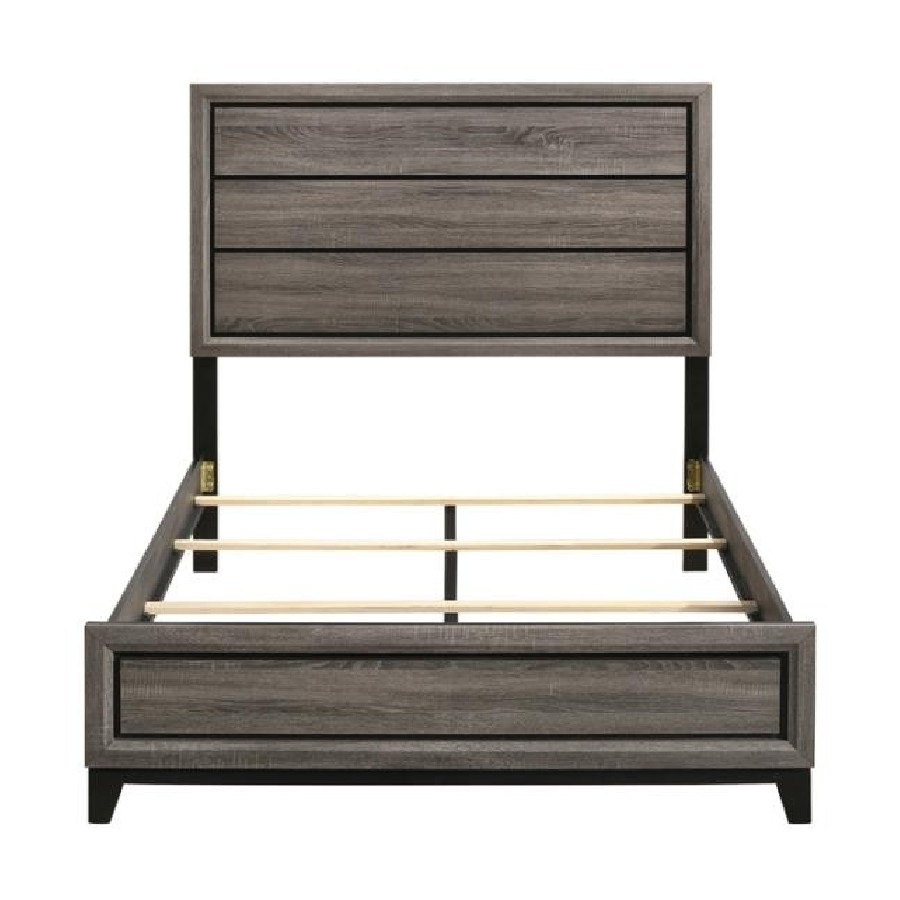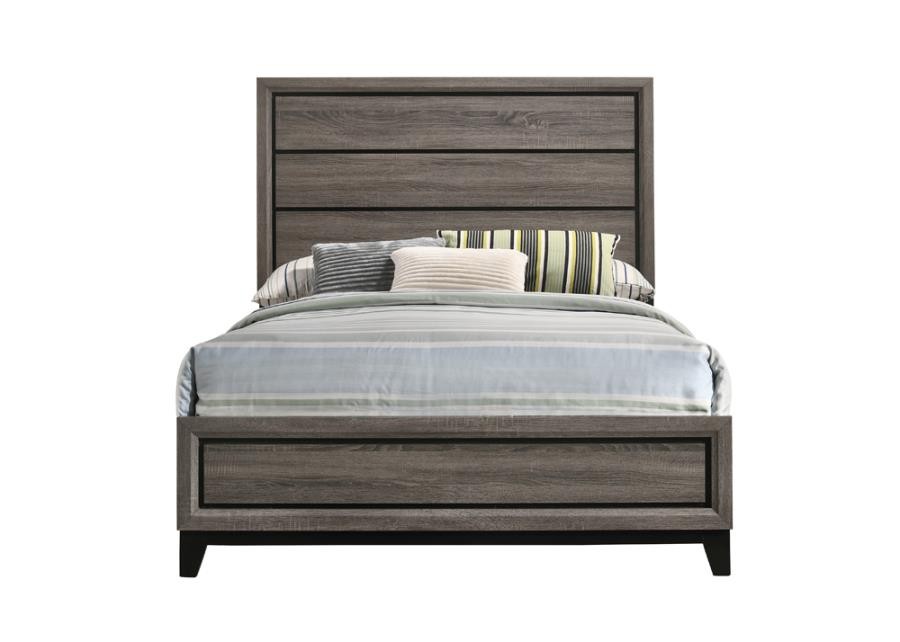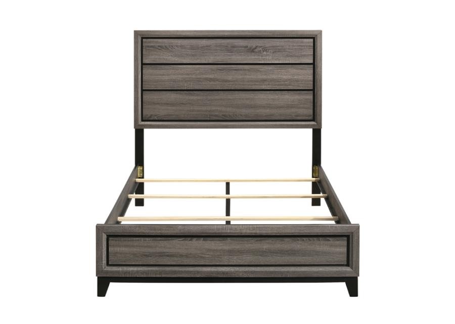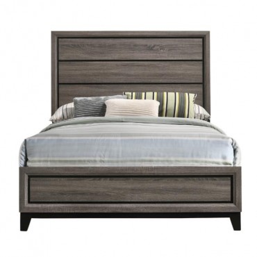 This modern panel bed combines sleek form and transitional appeal to create a timeless centerpiece for any bedroom. Crafted from durable engineered wood, it features a two-tone grey oak and black finish that adds depth and contrast. The framed headboard and matching footboard showcase recessed horizontal grooves for subtle texture and visual interest. Supported by solid hardwood legs, this bed blends durability with contemporary sophistication and pairs effortlessly with a variety of bedroom furnishings.