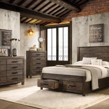 Bring warmth and function into the bedroom with this transitional storage panel bed. Crafted with a tall paneled headboard, it showcases clean lines highlighted by a rustic golden brown matte finish with wire-brushed details. The footboard features two spacious drawers with wooden pull handles, perfect for storing blankets or linens. Solid block-style legs provide sturdy support, while the blend of hardwood and veneer construction ensures lasting durability. This bed combines timeless style with modern storage convenience.