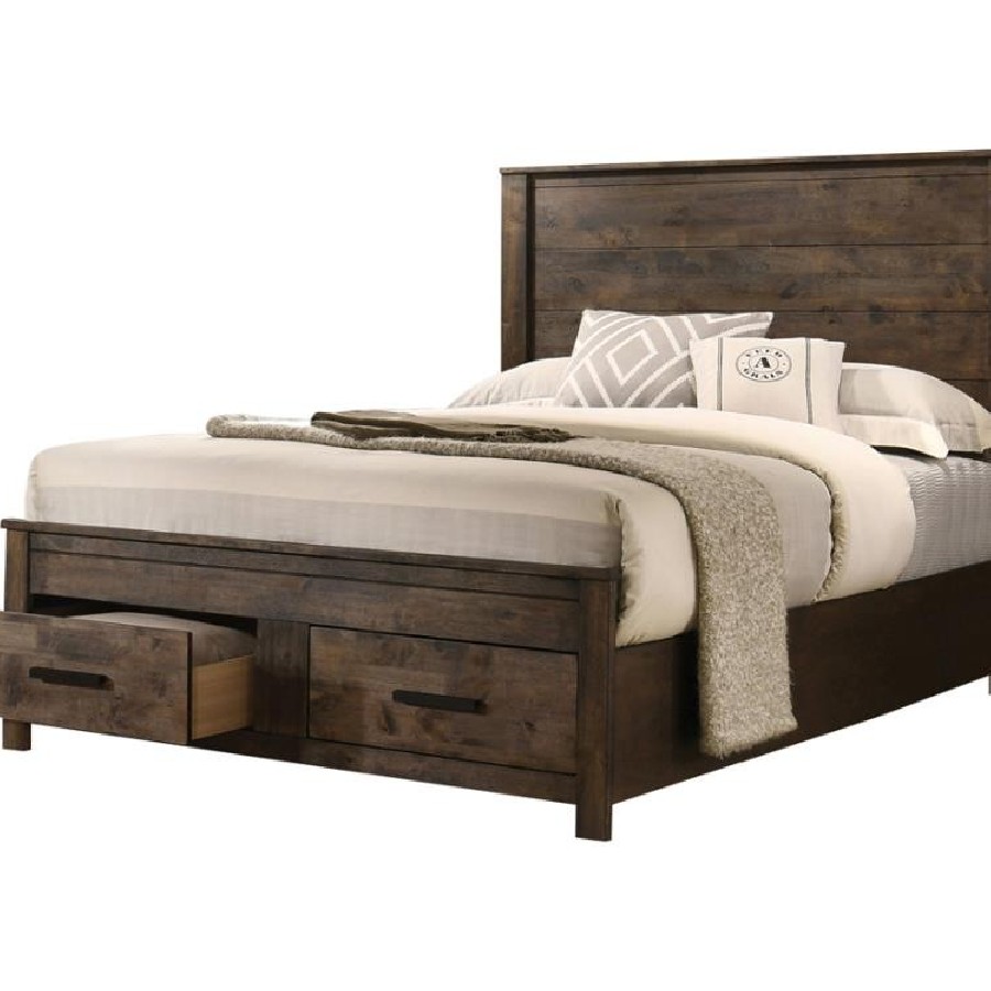 Bring warmth and function into the bedroom with this transitional storage panel bed. Crafted with a tall paneled headboard, it showcases clean lines highlighted by a rustic golden brown matte finish with wire-brushed details. The footboard features two spacious drawers with wooden pull handles, perfect for storing blankets or linens. Solid block-style legs provide sturdy support, while the blend of hardwood and veneer construction ensures lasting durability. This bed combines timeless style with modern storage convenience.
