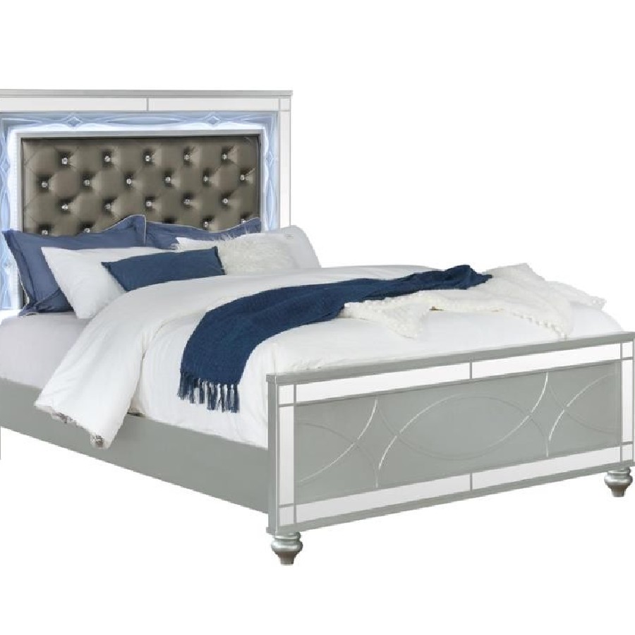 This glamorous contemporary bed features a variety of features that make it a must-have in any modern home. This exclusive Coaster design comes in a shimmering silver metallic finish that enlivens any space. The imposing headboard is upholstered with metallic leatherette that's fully tufted with crystal buttons. The headboard also includes white LED touch lighting so you can enjoy a vibrant ambiance. Solid block legs on the headboard and exquisite bun feet on the fret work detailed footboard come together to finalize the style of this fabulous bed.