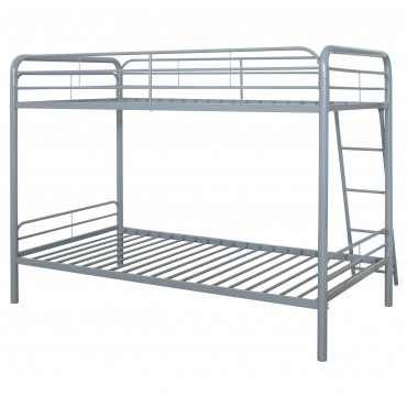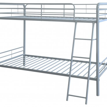 Maximize sleeping space with this modern metal bunk bed, designed for strength, safety, and everyday functionality. Its powder-coated glossy finish enhances the sleek silhouette, while full-length guardrails on the top bunk ensure secure rest. A built-in ladder provides stable access, integrated directly into the frame for a clean look and compact footprint. With metal slat support for both sleeping surfaces, this bunk bed eliminates the need for foundations and suits shared rooms with style and durability.
