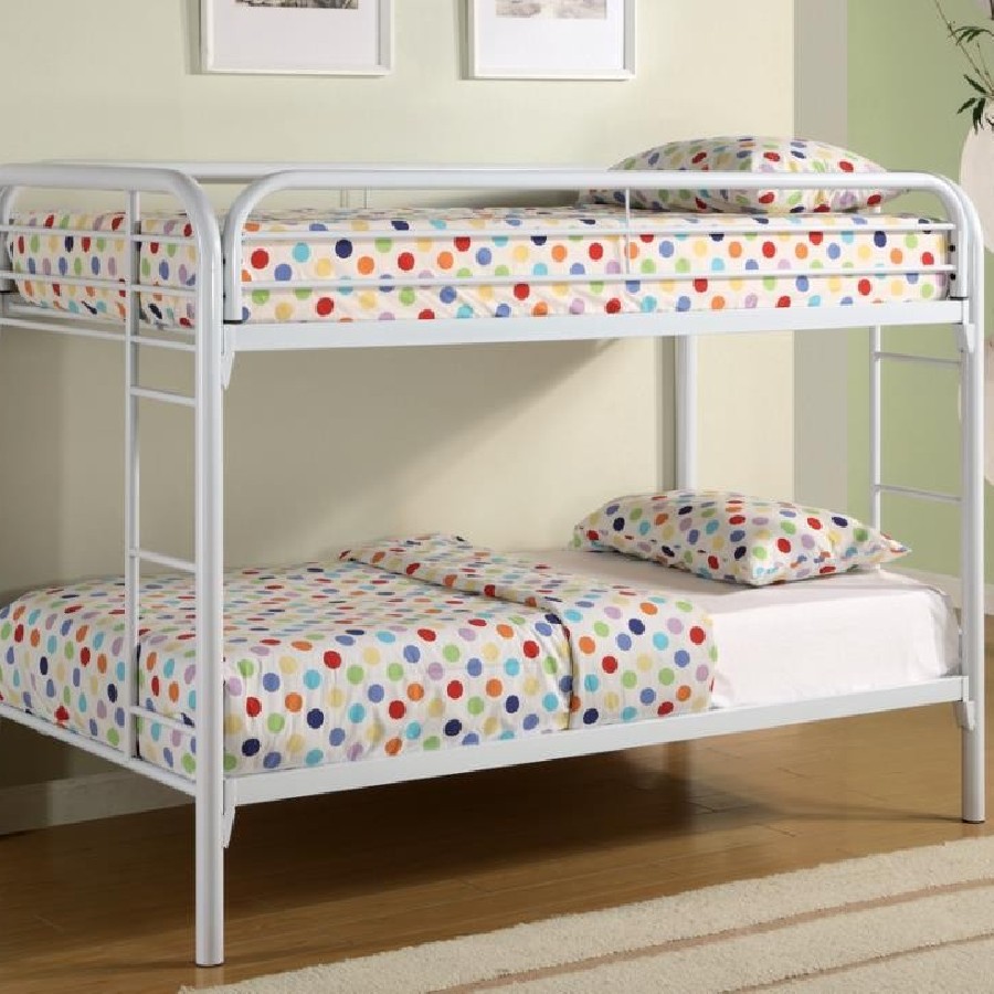 Update a child's room with the elongated lines in this twin bunk bed. The metal frame is open and supportive, with built-in ladders on each side and a full-length guard rail. This twin over twin bed offers a clean feel with its crisp white finish. With straight elongated legs, the silhouette elevates any modern motif. The rounded edges around the top rail add a delicate feel to any small and shared room.