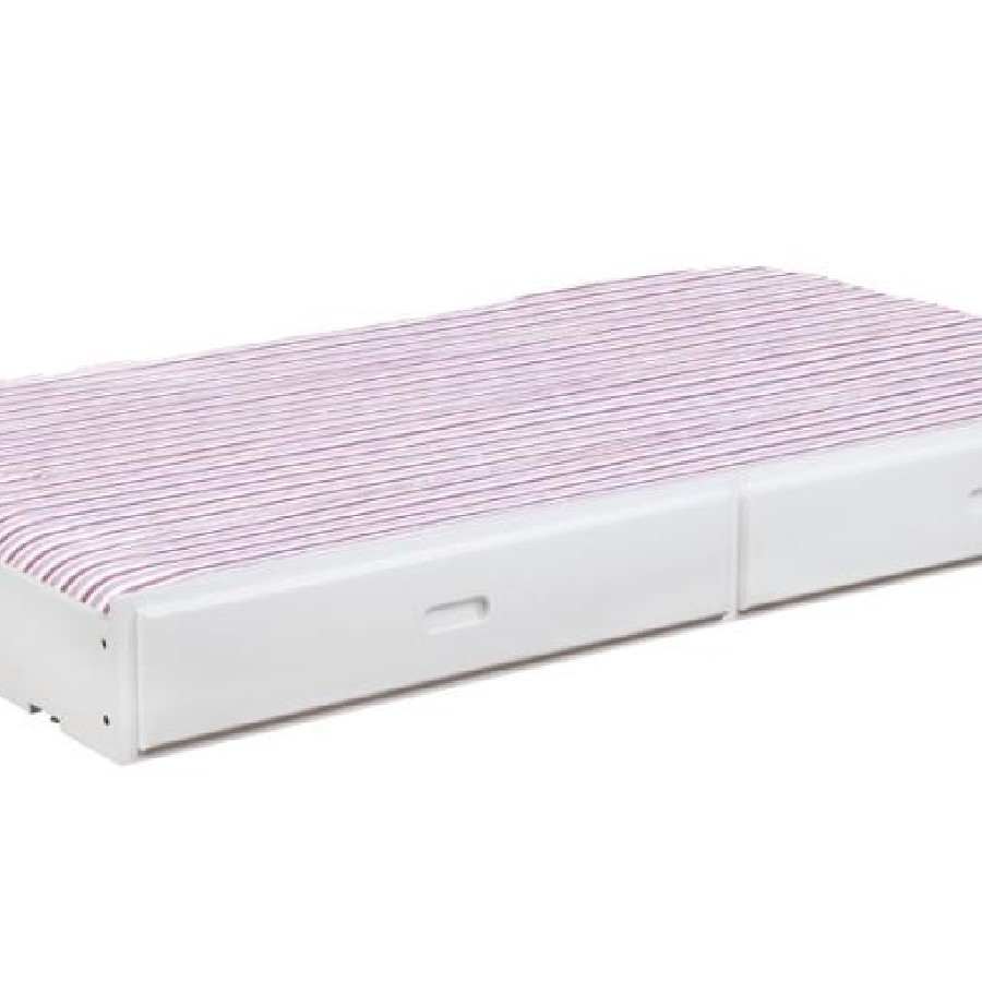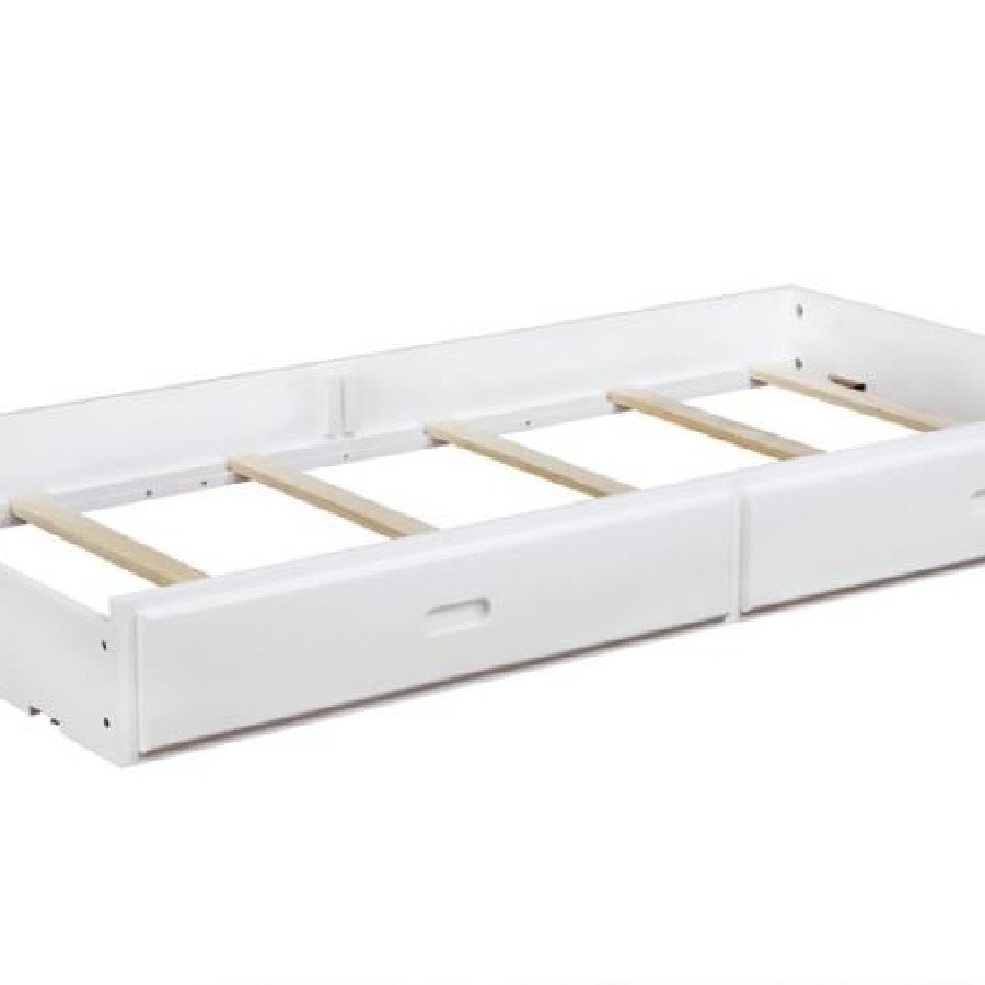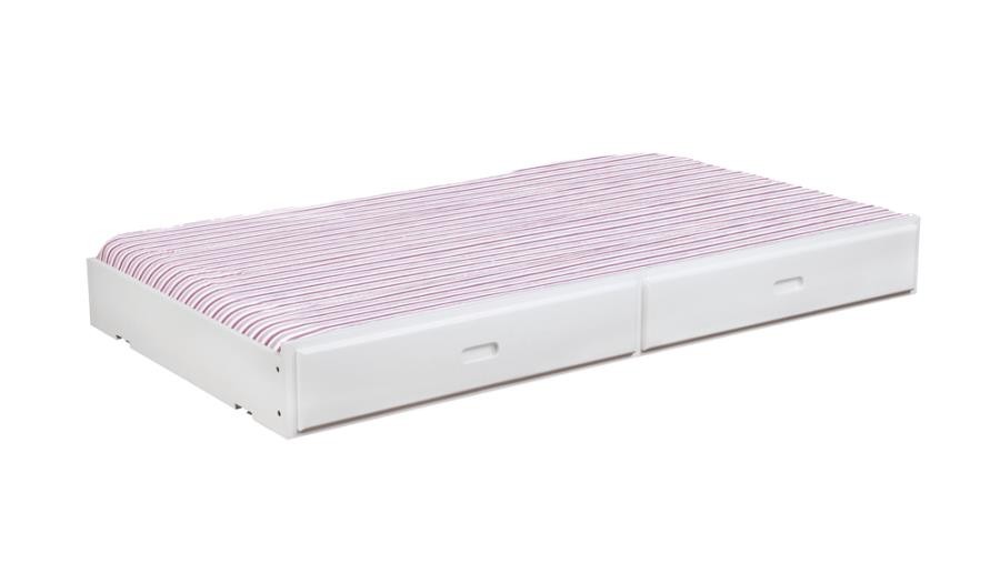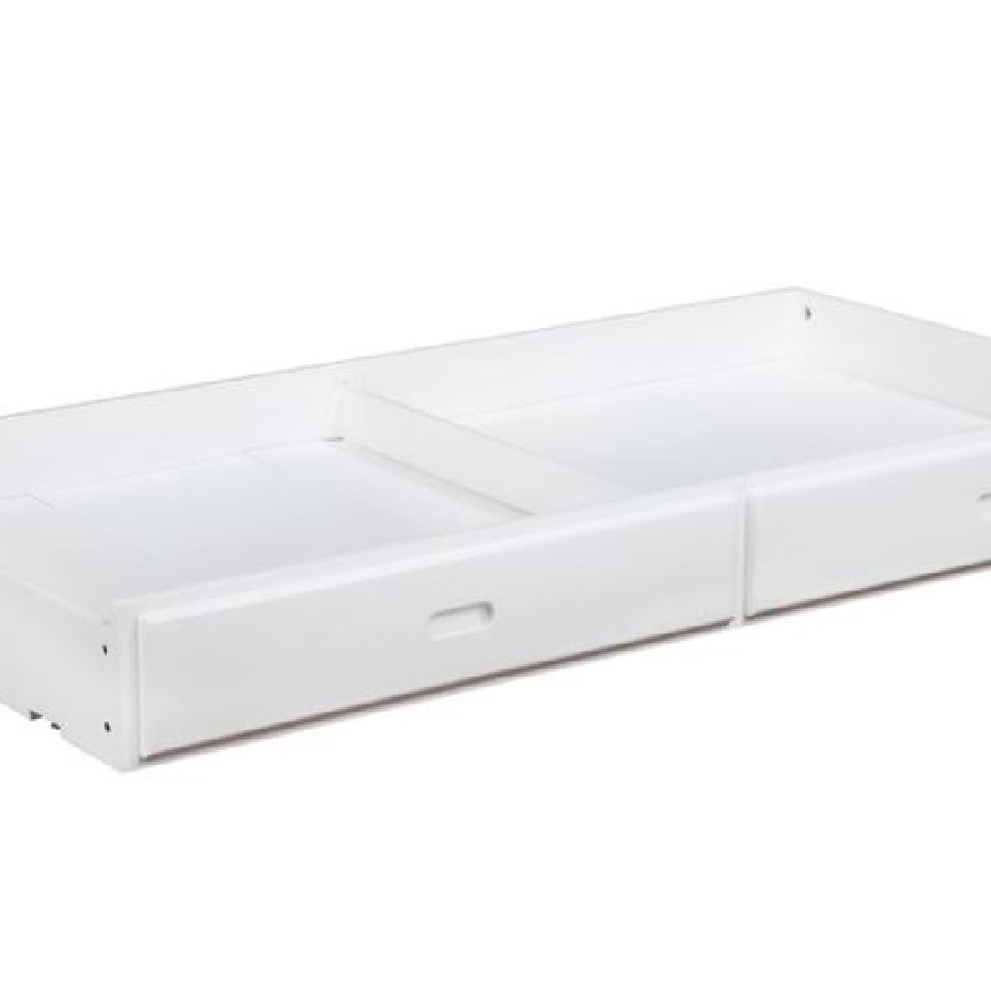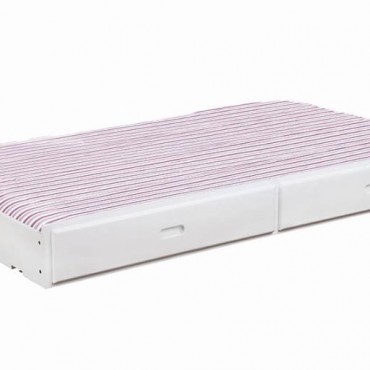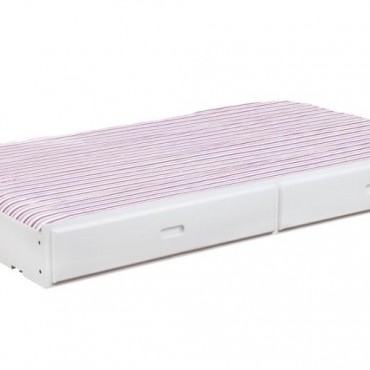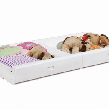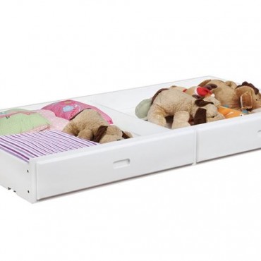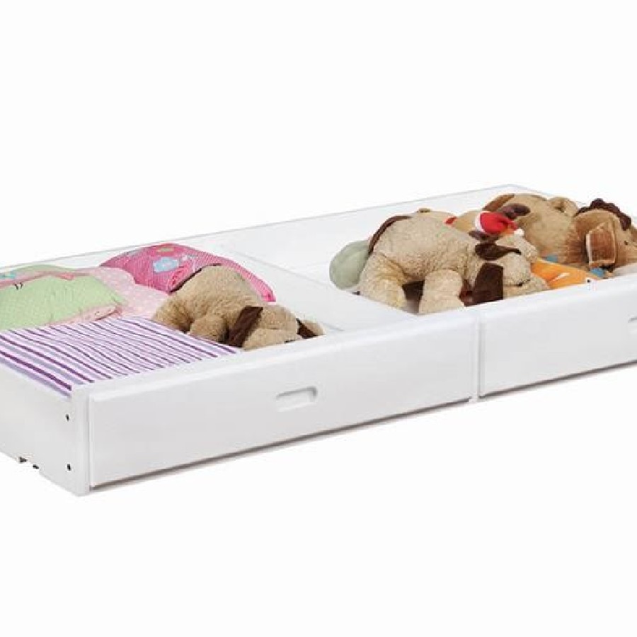 The ultimate space saver, this universal storage trundle easily converts between a storage drawer and trundle bed. Crafted of solid pine, this piece includes six-piece slats and plywood boards. Sleek and smooth, the flat fronts feature smooth built-in handles that don't protrude for fun play time. Separate the drawer into two sections to organize extra linens and toys effortlessly. Bunkie board not required, this stylish storage trundle works well with a variety of decor motifs.