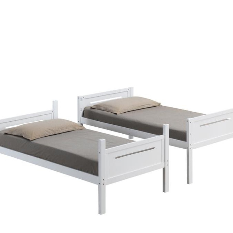 Save space and bring modern simplicity to a youth or guest bedroom with this twin over twin bunk bed. The minimalist square frame features straight headboards and footboards with slim notched panel details for a contemporary look. An angled ladder provides easy access to the top bunk, which is secured with guardrails for added safety. For flexible use, the frame can be separated into two individual beds. Constructed from durable rubberwood, this bunk bed is built to last and includes slat kits for mattress support.