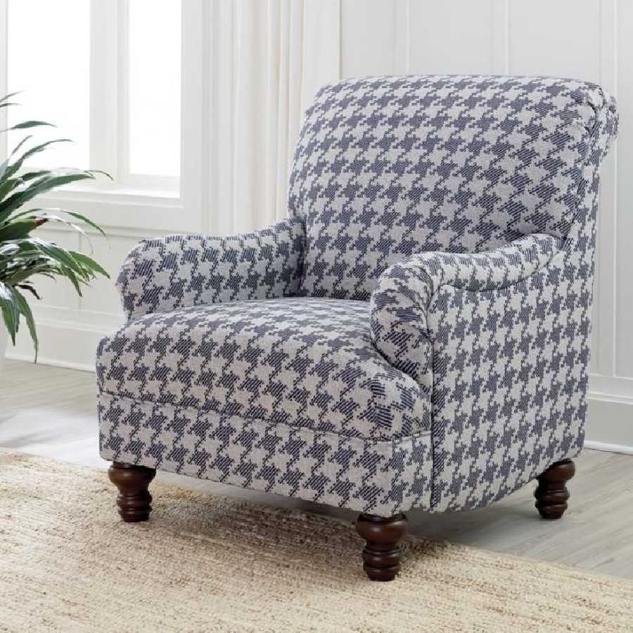 A standout houndstooth check pattern draws due attention to this fashionable accent chair. With tailored English arms and turned legs offering a contrasting espresso finish, this chair impresses with a blue and light grey upholstered cover. A solid wood frame with a sinuous spring deck sets the stage for durability. Attached seat and back cushions remain stationary to prevent shifting. Offer upbeat personality and a whimsical touch to a modern space with soft elements in this enticing chair.