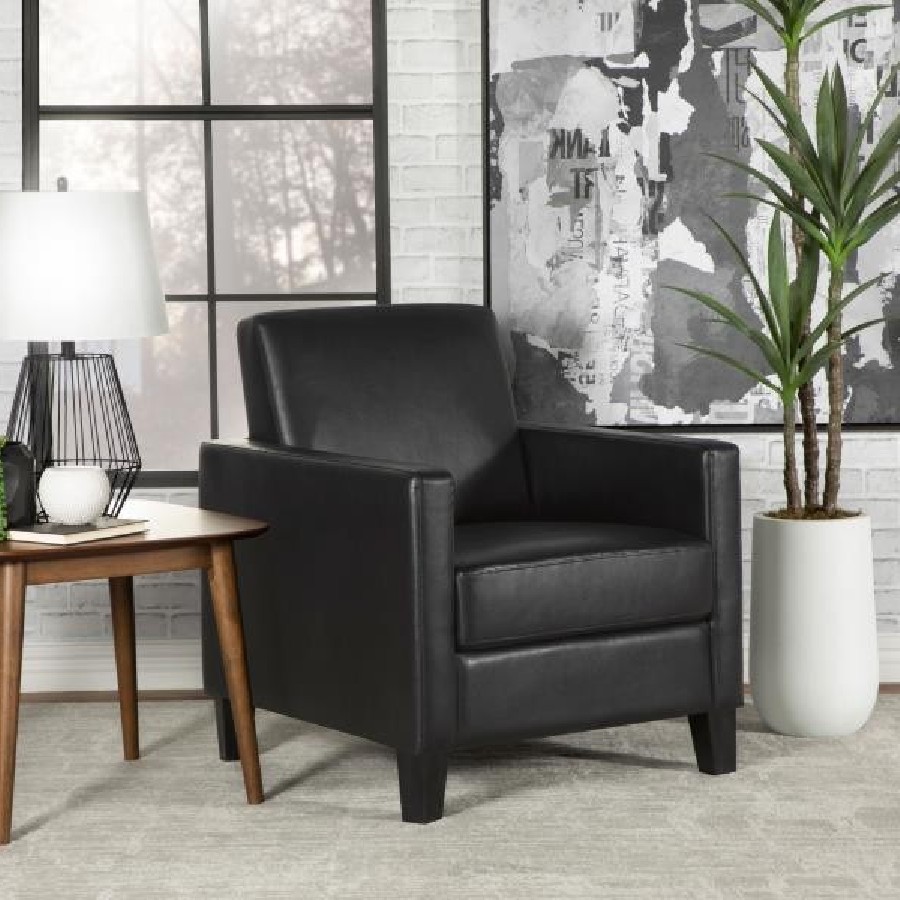 Mid-century design elements shine through in this contemporary accent chair. With classic, narrow track arms that cradle you as you recline into an angled backrest, this accent chair offers a tailored, polished vibe to a corner space or seating area. Top stitching details outline the silhouette of the black faux leather fabric for a subtle accent. Rested on tapered square legs, this accent chair offers a slight elevation to showcase rugs and flooring beneath. A black finish throughout, this contemporary accent chair lends itself to a variety of color palettes and lends a moody modern touch to a space.