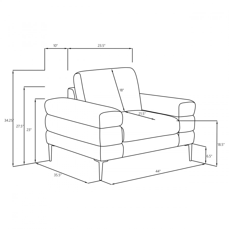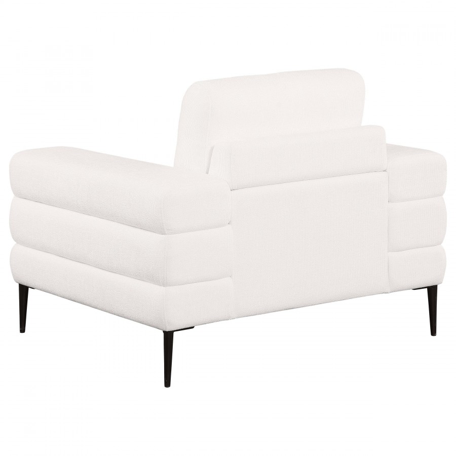Bring modern sophistication into your home with this stunning ivory chair. The chair features tube-like geometric sculptured track arms, adding a unique and stylish design element. Upholstered in beautiful ivory chenille basket weave fabric, it offers a luxurious and comfortable seating experience. The supportive reversible back cushions ensure long-lasting comfort and can be easily flipped for even wear. The thin metal legs add to the chair's modern appeal, providing a light and airy look while maintaining a sturdy foundation.
