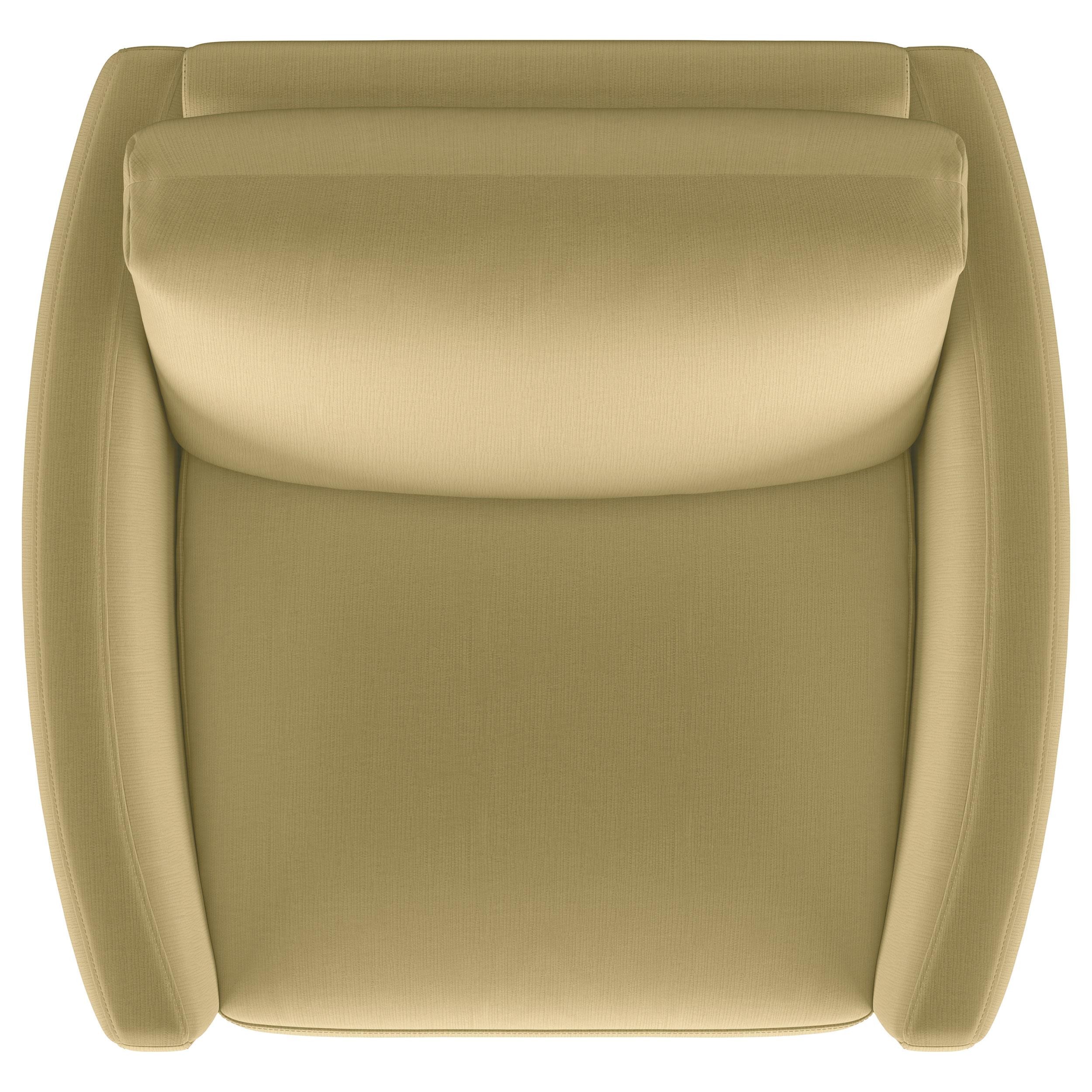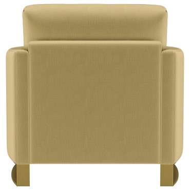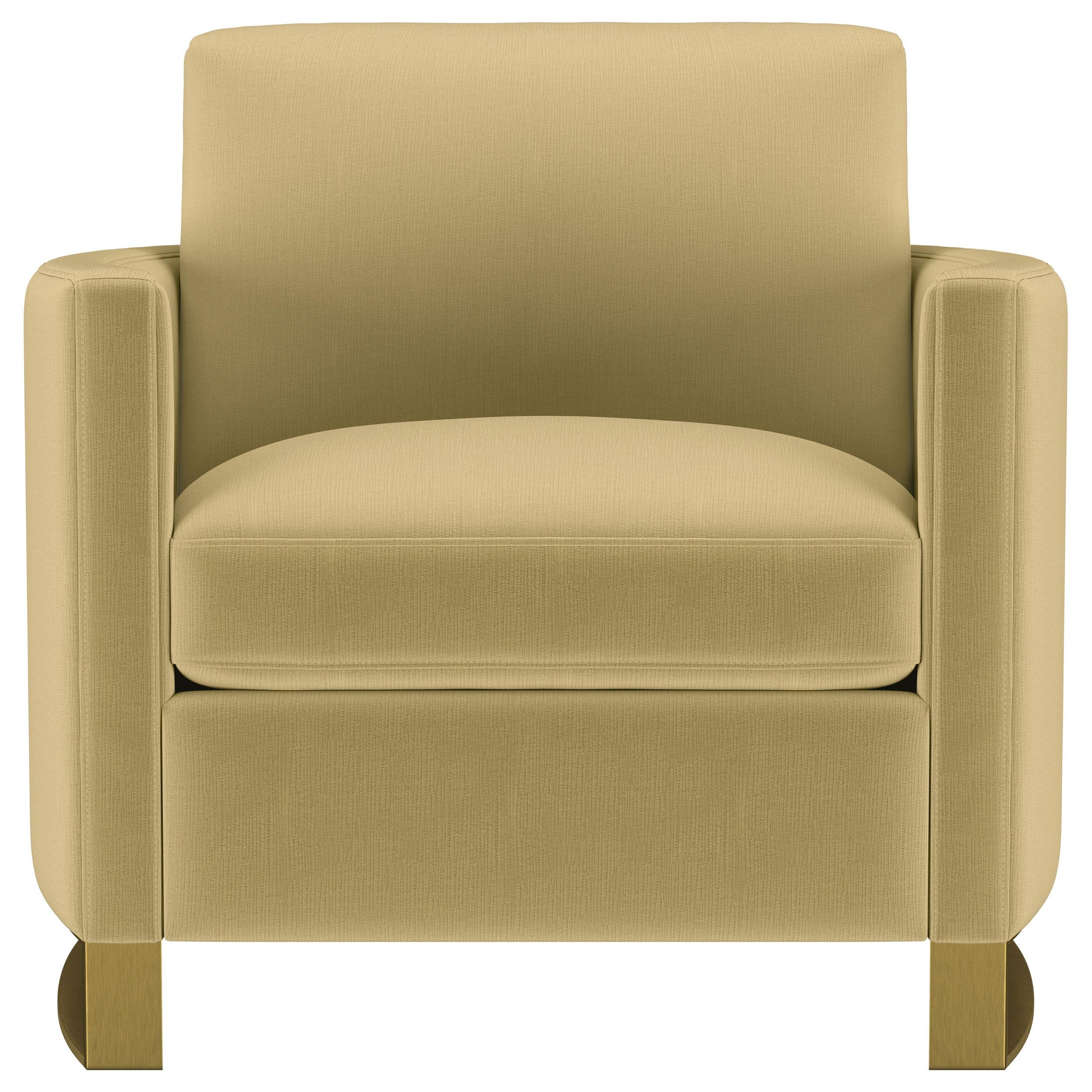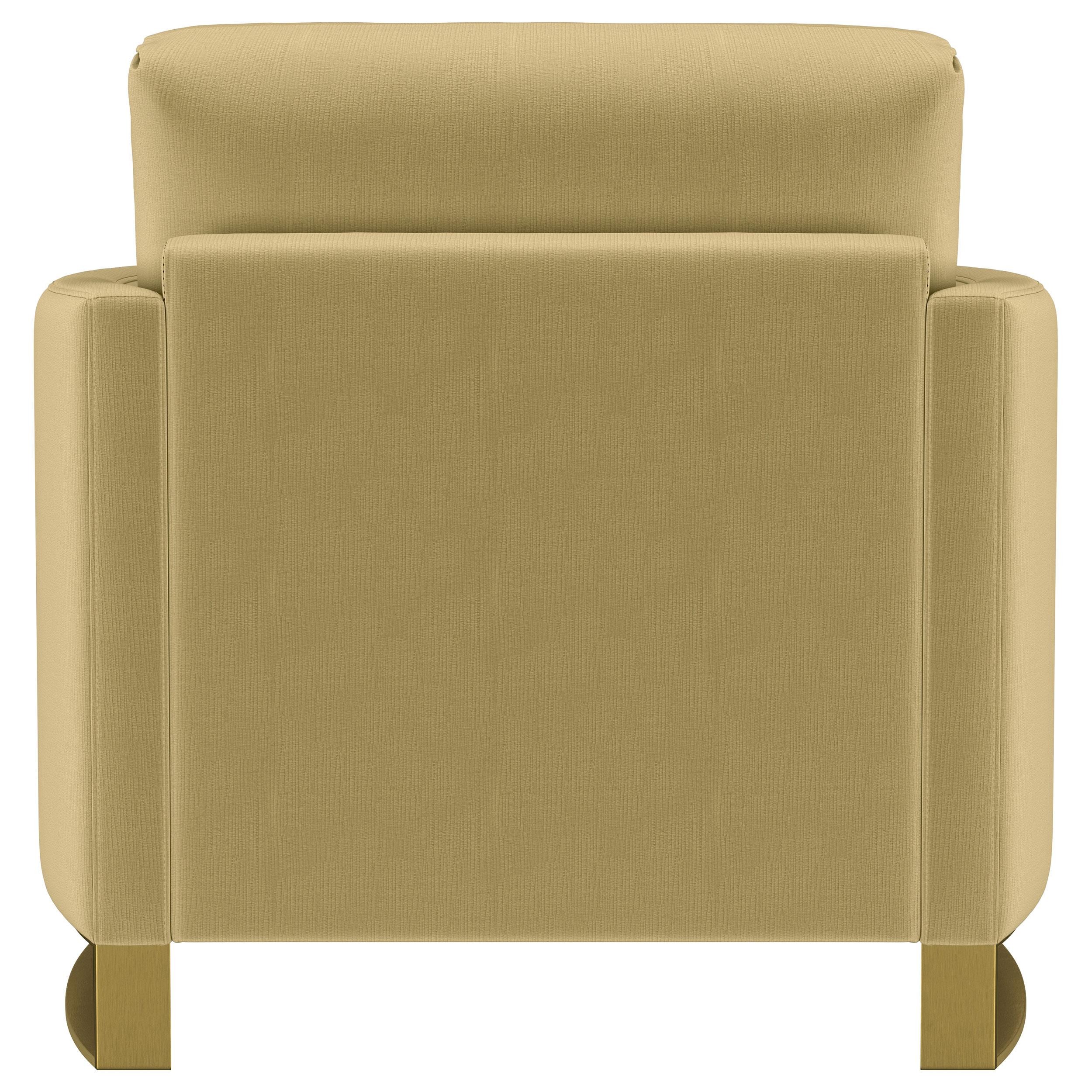 Indulge in opulent comfort with this textured velvet chair. Its reversible feather blend seat and back cushions, complemented by curved arms and gold stainless steel legs. Smooth upholstery and lustrous details blend simplicity with timeless splendor, making this piece a perfect focal point for refined interiors. With its inviting profile and graceful presence, it elevates both style and relaxation.