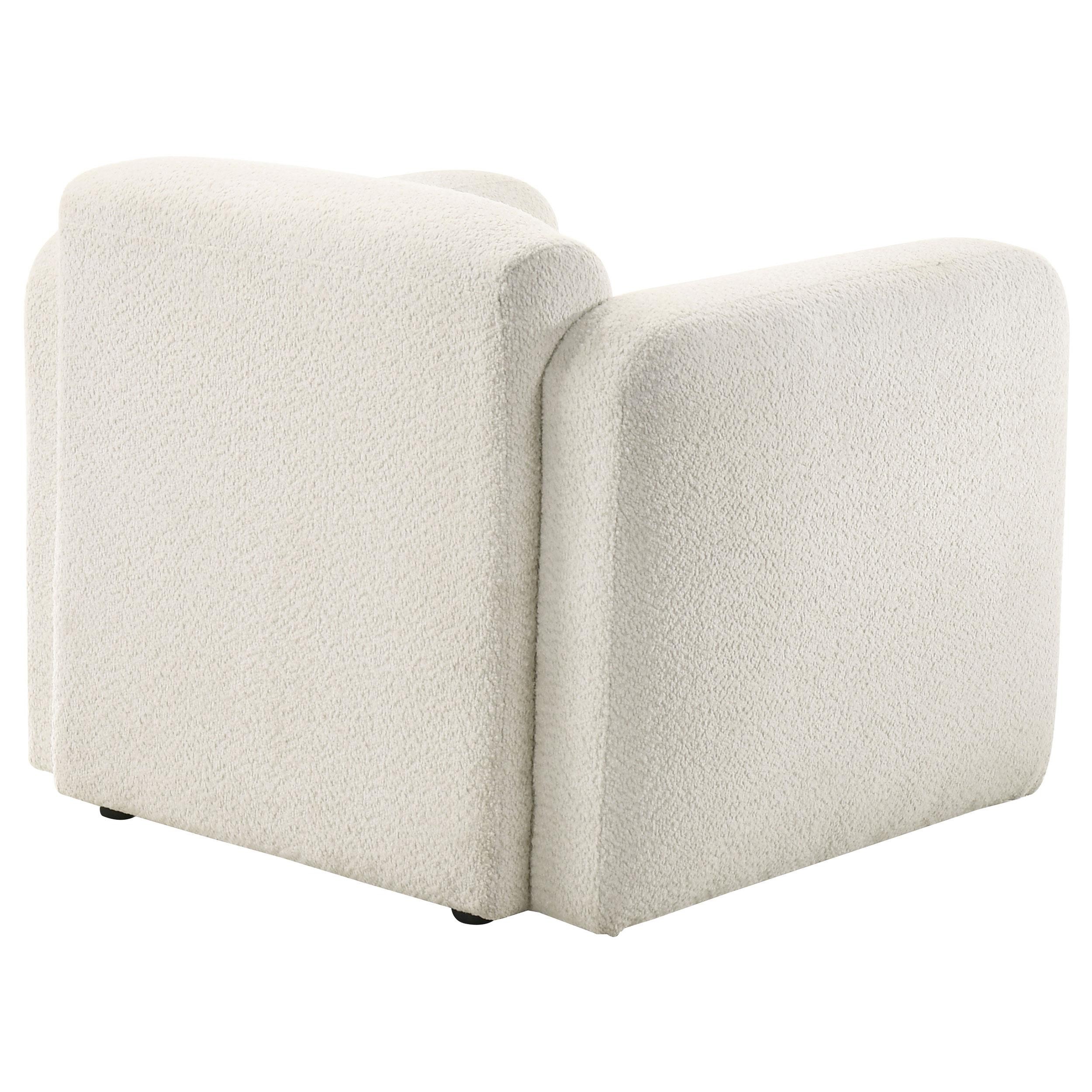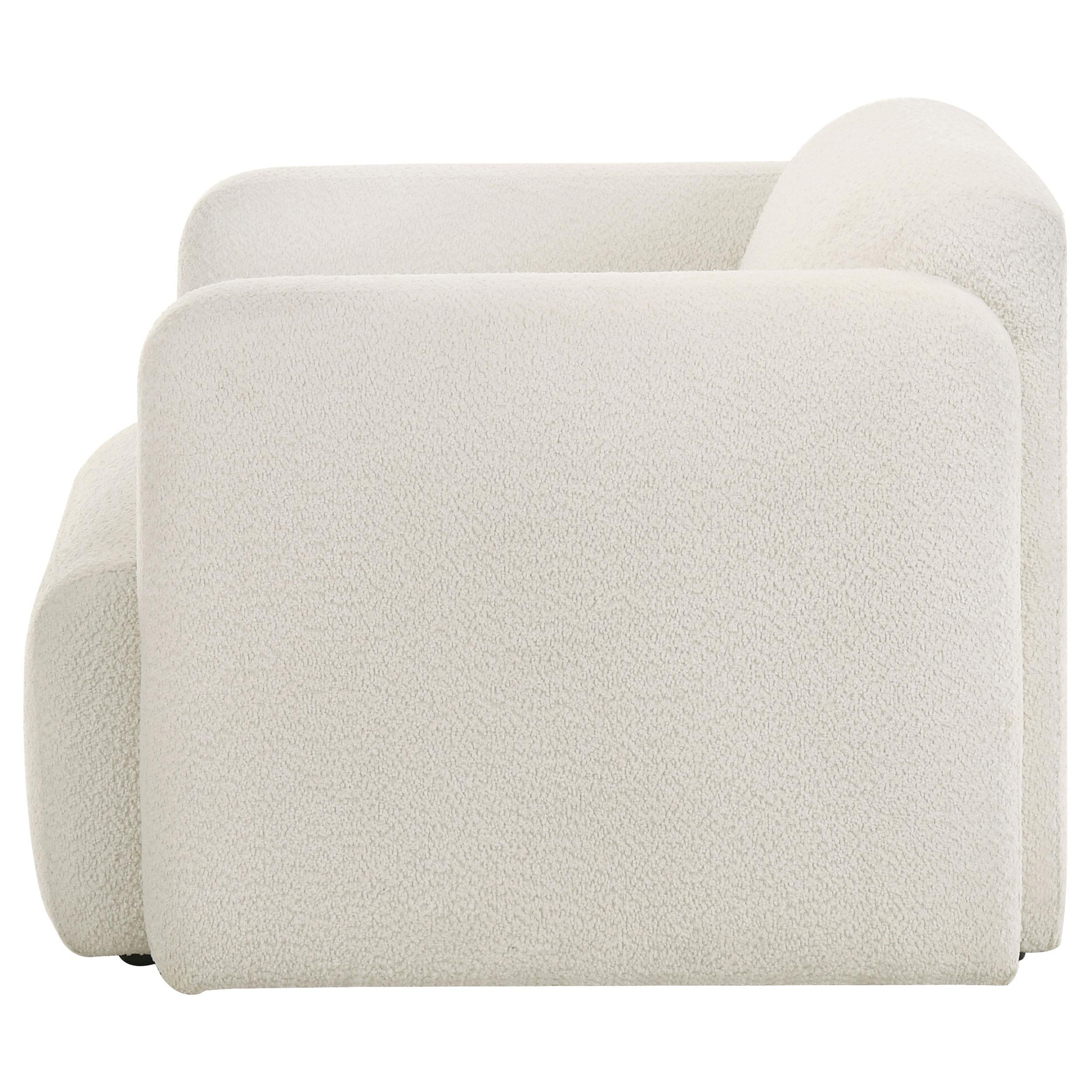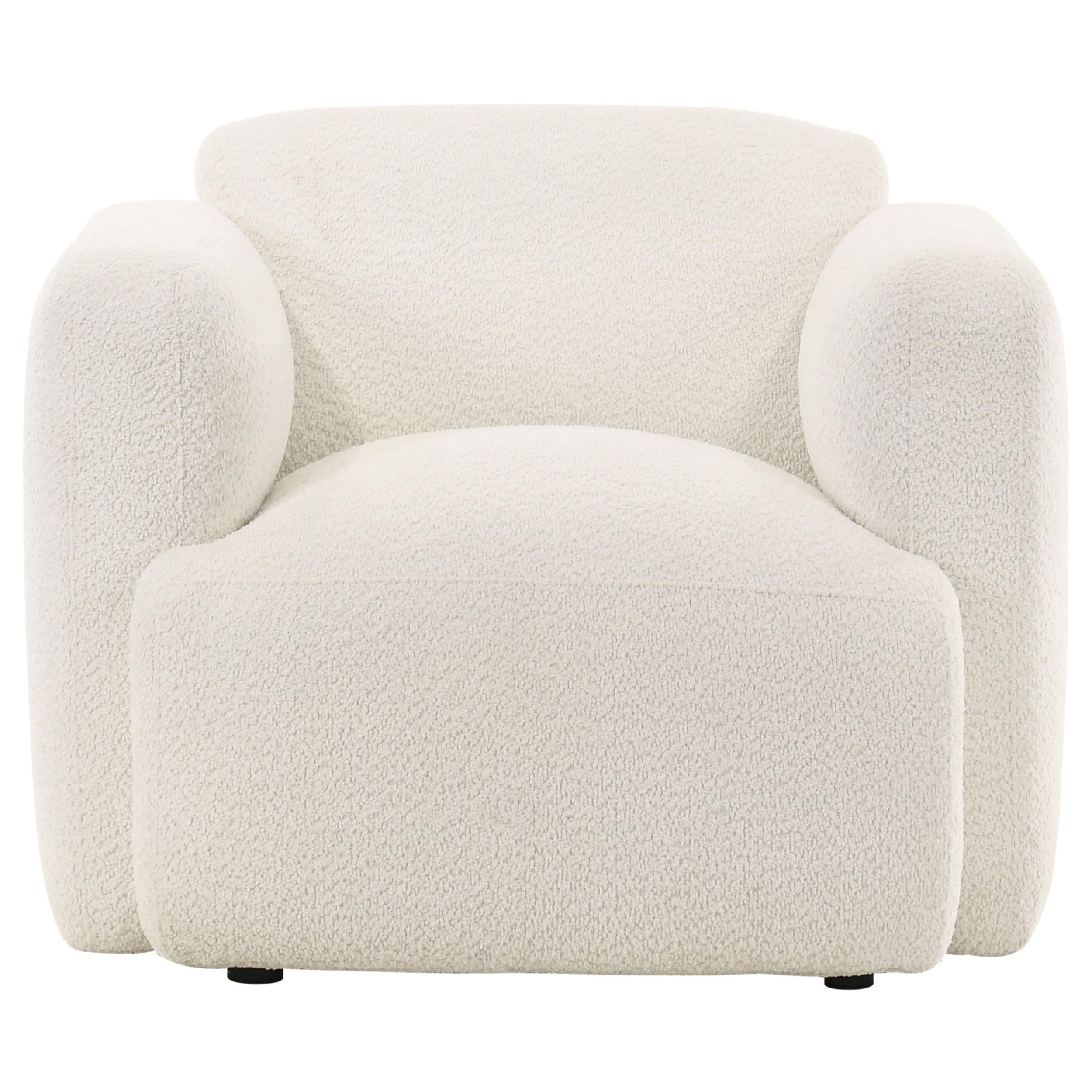 This modern accent chair brings sculptural softness and deep comfort to any living space. Wrapped in a richly textured fabric, its rounded frame flows from low-profile back to wide track arms with effortless ease. Plush foam cushioning and pocket coil seating deliver the ideal blend of sink-in softness and lasting support. With its minimal silhouette and gentle curves, this chair adds a cozy yet elevated presence to any room.