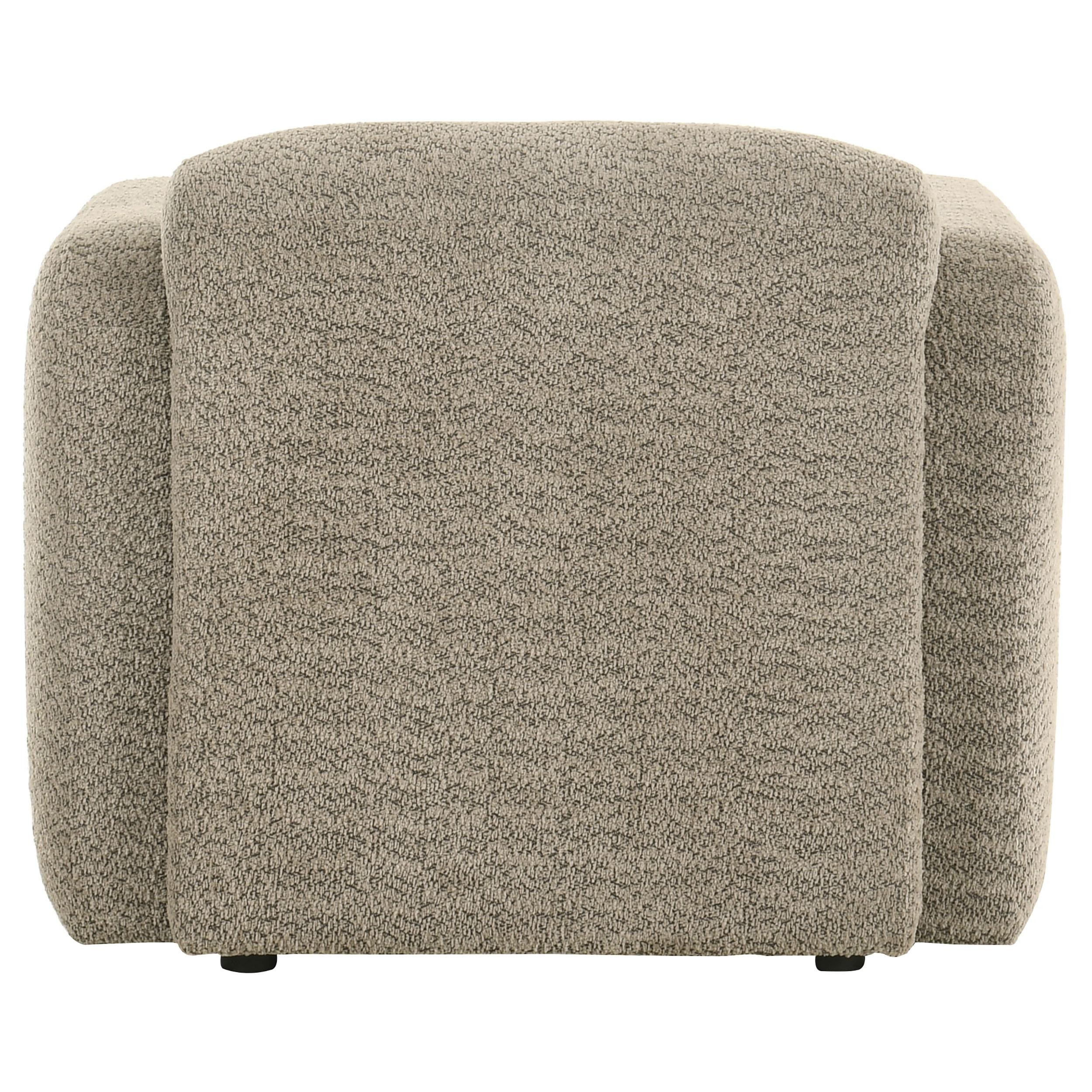 This modern accent chair brings sculptural softness and deep comfort to any living space. Wrapped in a richly textured fabric, its rounded frame flows from low-profile back to wide track arms with effortless ease. Plush foam cushioning and pocket coil seating deliver the ideal blend of sink-in softness and lasting support. With its minimal silhouette and gentle curves, this chair adds a cozy yet elevated presence to any room.
