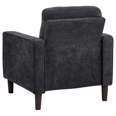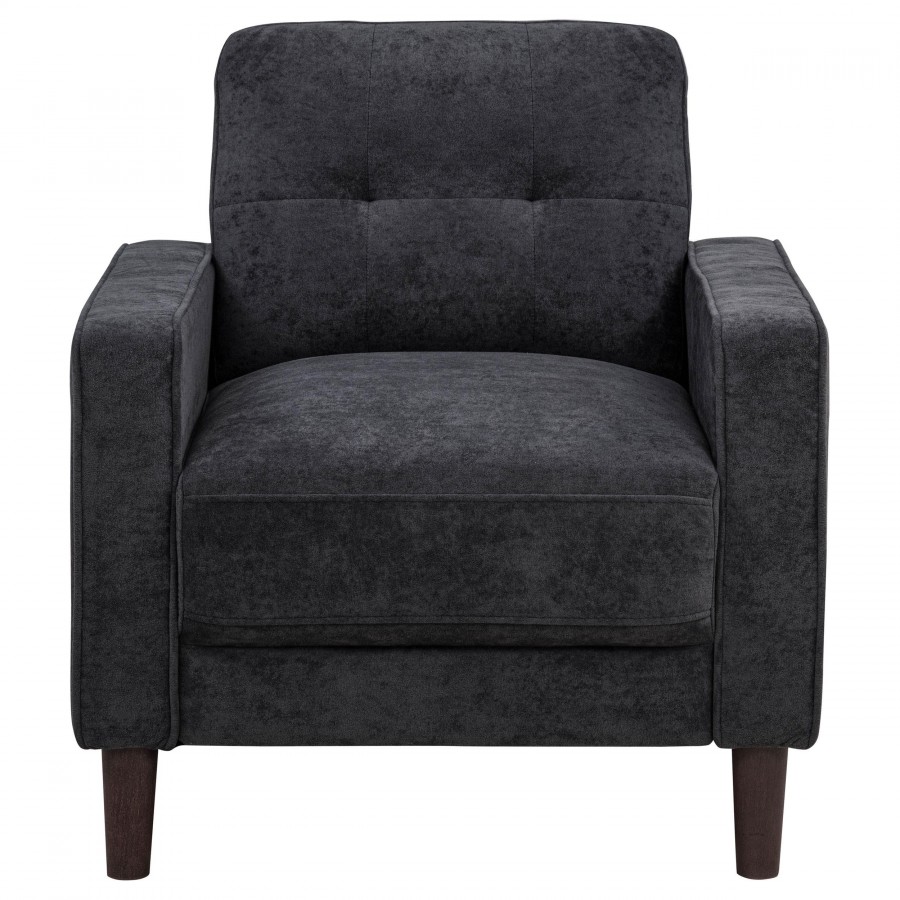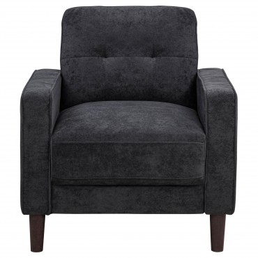 This modern accent chair brings cozy scale and crisp structure to any compact space. Wrapped in soft, textured upholstery, it features slim track arms with cord welt trim and a grid-tufted back for tailored charm. A pocket coil seat offers long-lasting comfort, while tapered round legs provide a stable, elevated base. Perfectly sized for apartments, bedrooms, or reading nooks, this chair delivers a refined yet inviting presence.