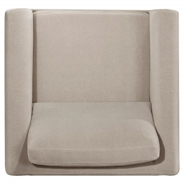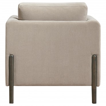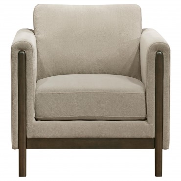 Clean lines and cozy form unite in this upholstered accent chair, a refined piece grounded in simplicity. Framed in engineered wood with a rich coffee finish, its recessed panel arms and low profile evoke modern structure. Soft taupe polyester wraps plush, reversible cushions that offer lasting comfort and flexibility. Designed to coordinate with matching pieces or stand confidently on its own.