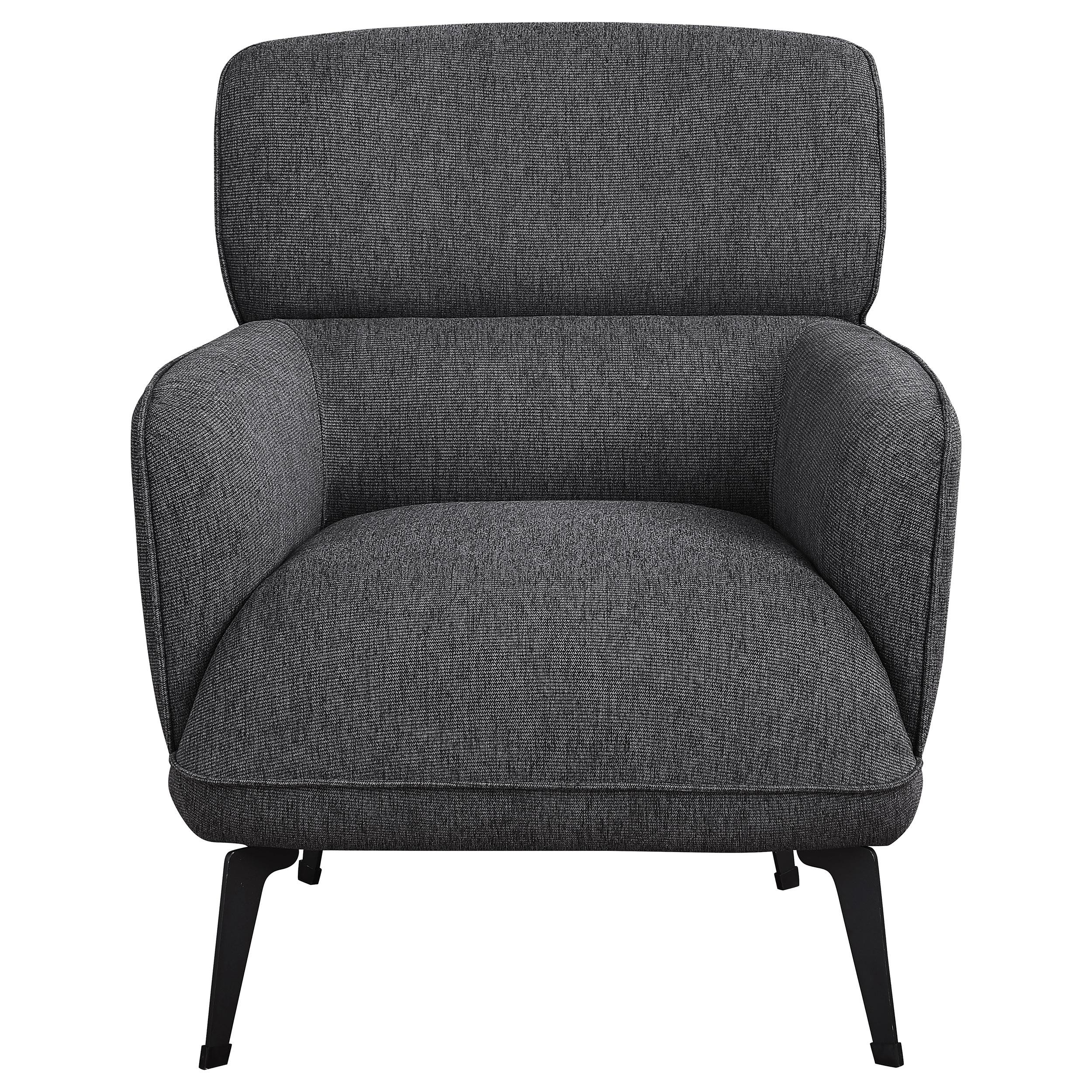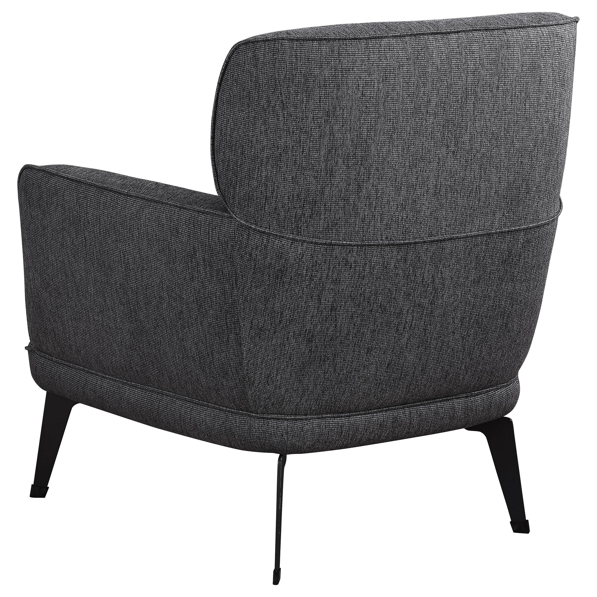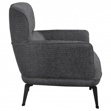 Check all the boxes for a comfortable and stylish addition to your living space. This chic accent chair reflects the best of both modern and transitional style elements. Gorgeous upholstery covers a chair made of wood products and padded with foam to create a luxurious seating experience. Rounded track arms and a deep non-removable seat cushion embellish the design of a chair that coordinates with a sleek seating group or sits alone in a library or bedroom. Set atop chic black metal legs, this chair becomes a favorite spot for stylish relaxation.
