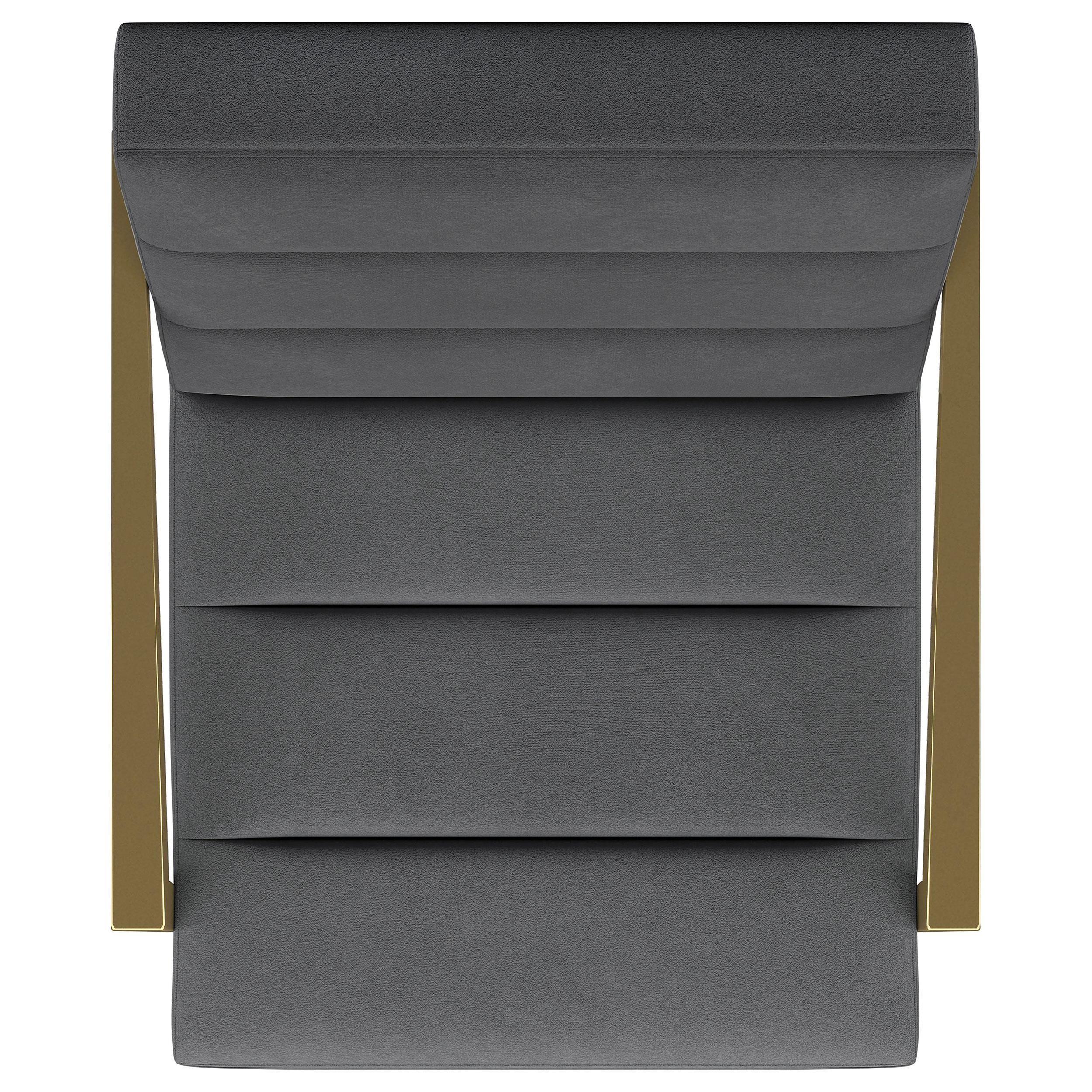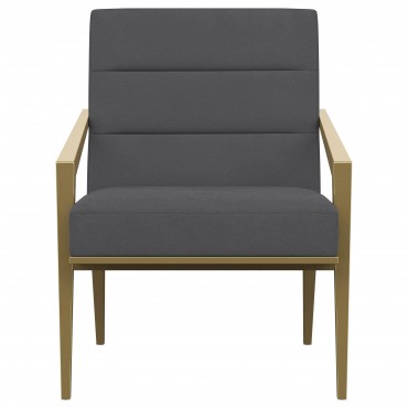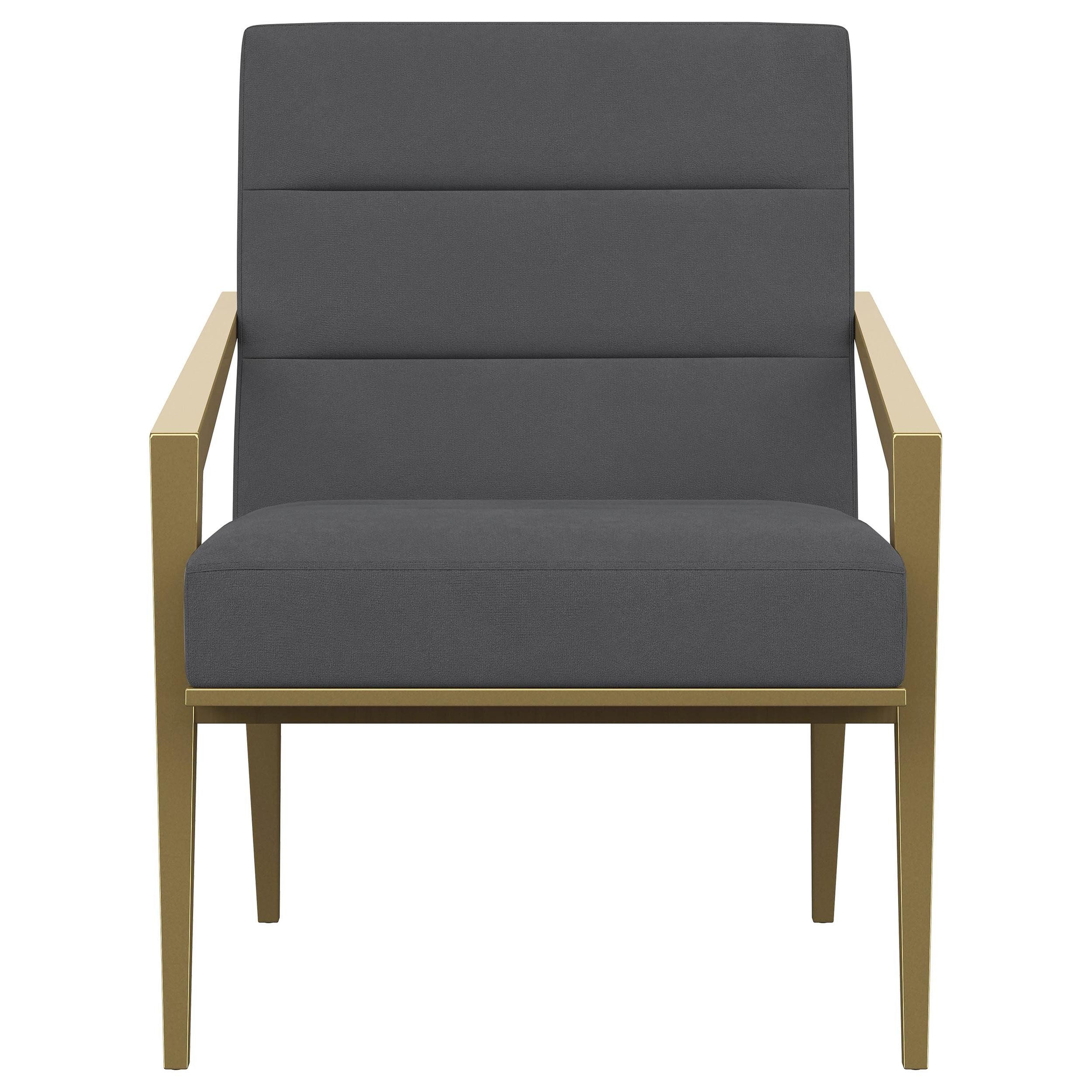 Restrained, modern style meets elegant artistry in a striking contemporary armchair. Designed to stand out, it boasts an upholstered seat and back with a metal frame and arms. The streamlined look receives a gleaming gold finish, adding sophistication anywhere from a sophisticated living room to a refined reception area in a professional space. Sloping, tapered arms define its silhouette, creating an accent chair that's sure to stand out. Channel tufting accents foam cushions, creating a sense of depth and dimension you'll appreciate in any setting.