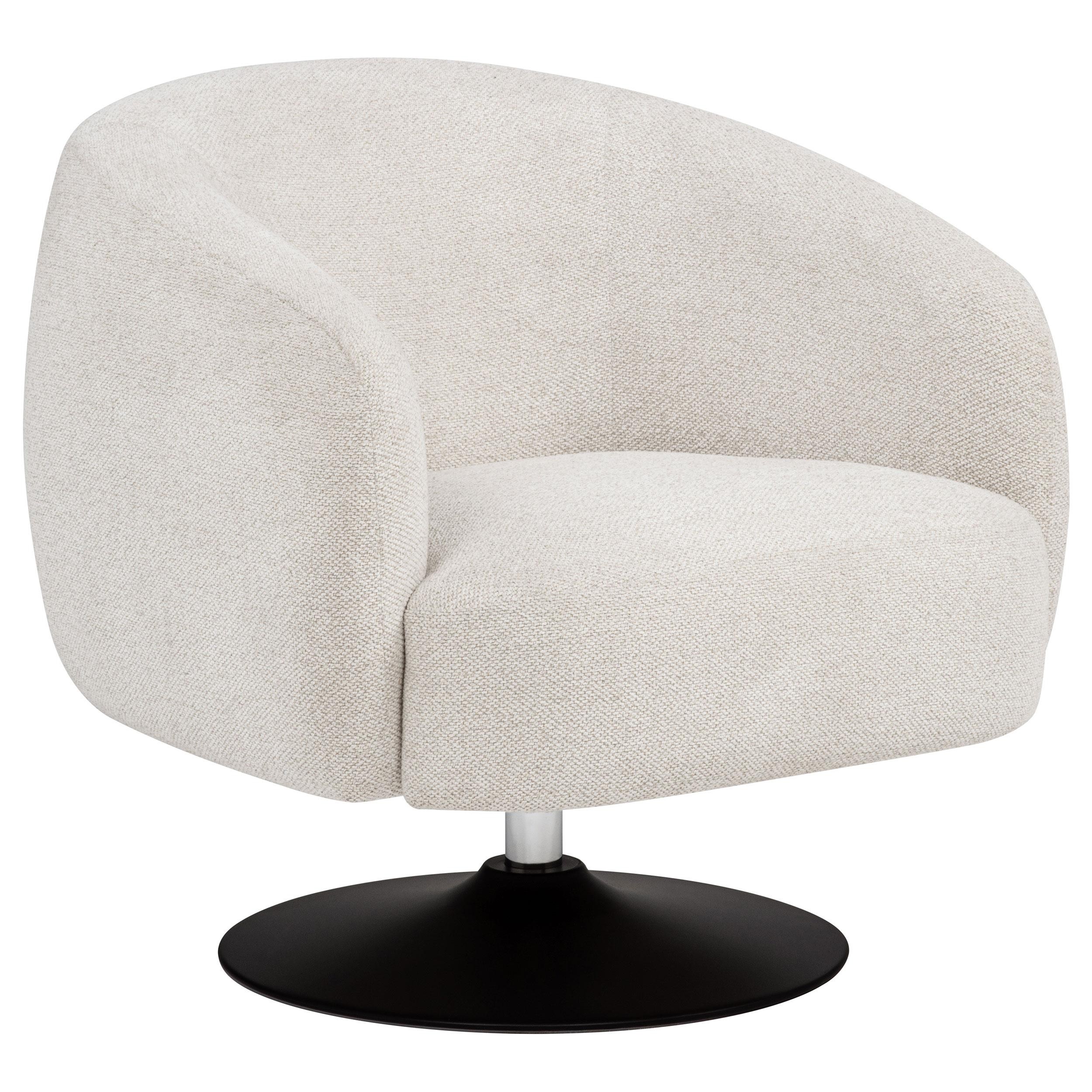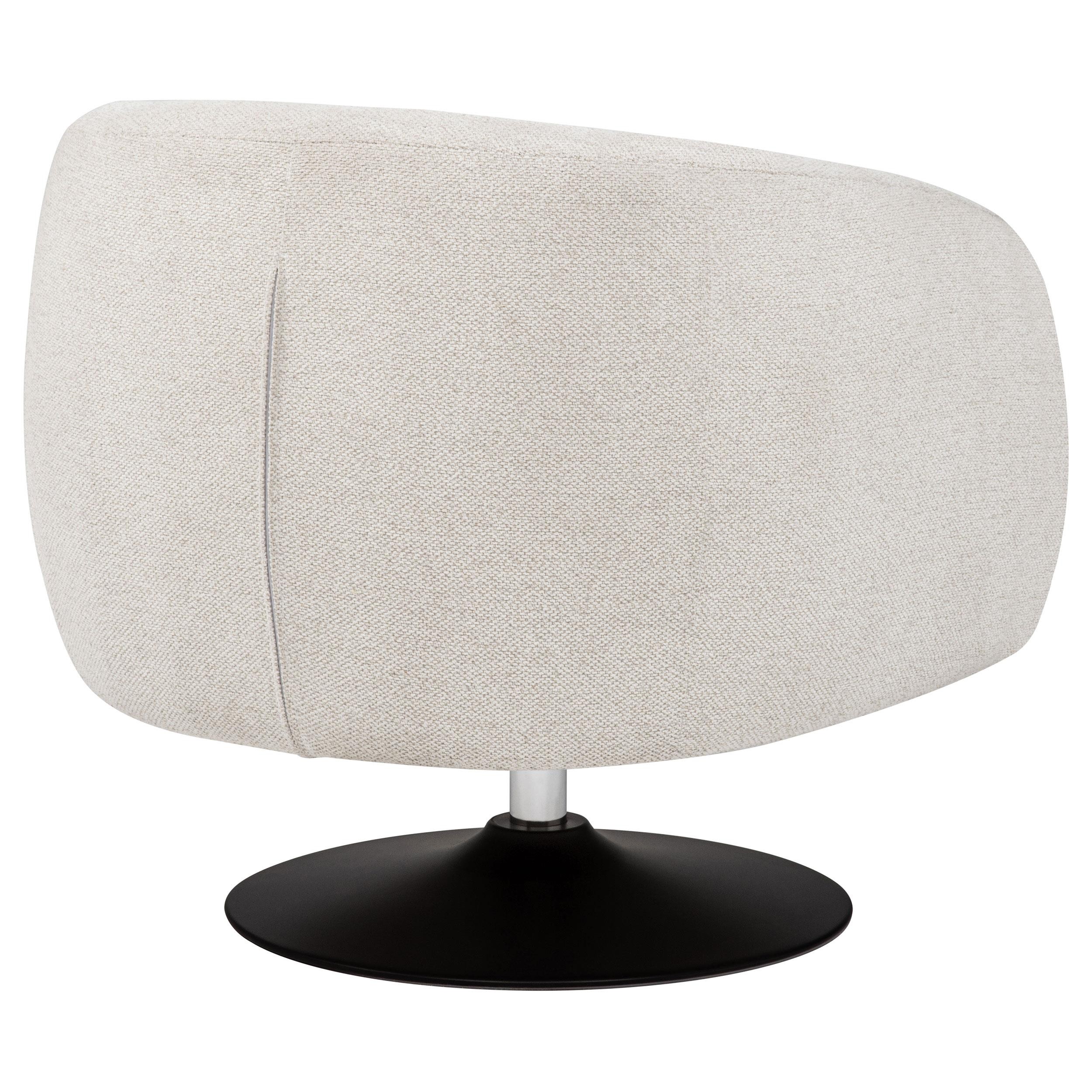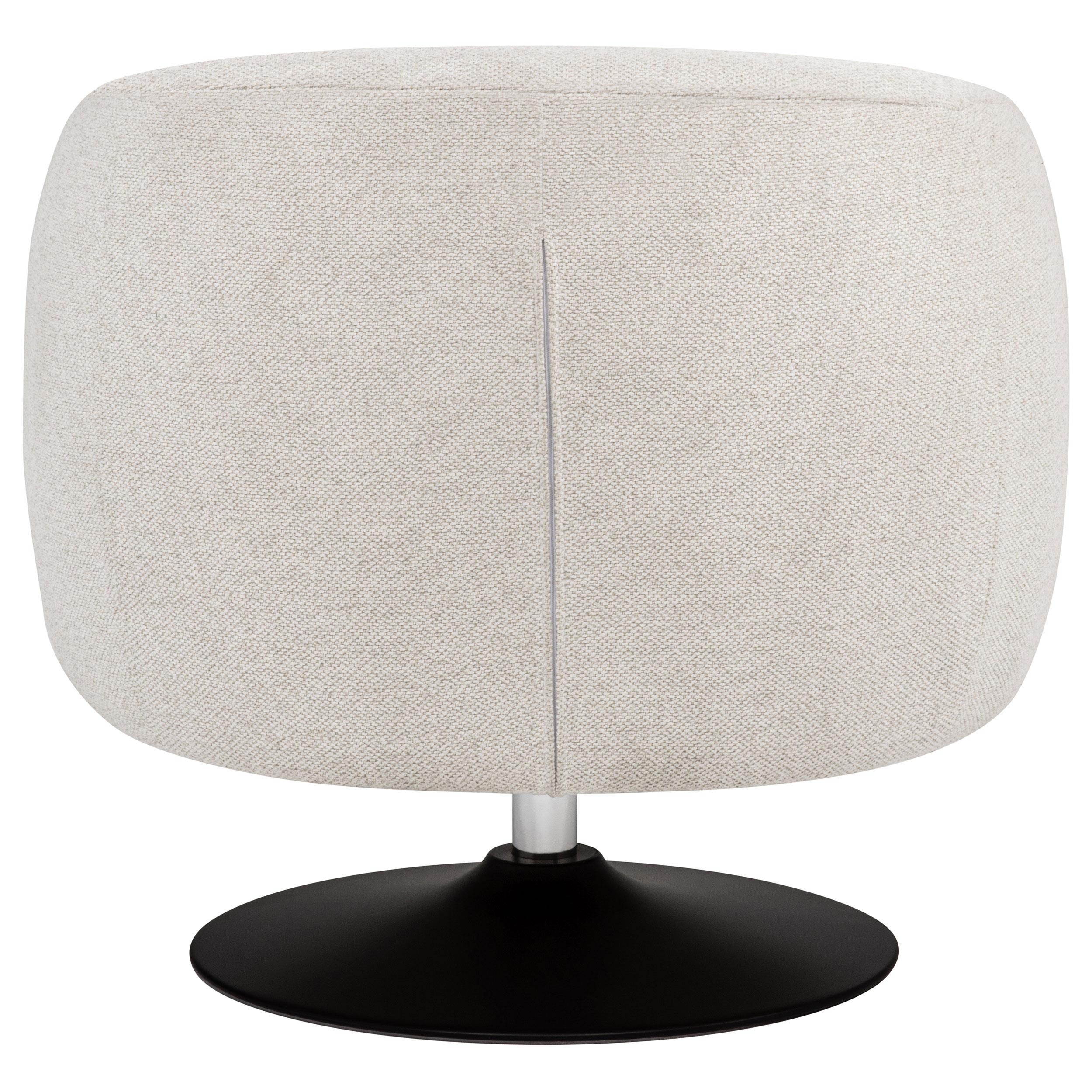 Elevate your seating area with this stylish swivel accent chair that blends modern sophistication with retro charm. Wrapped in soft beige boucle fabric, it offers a tactile texture and inviting comfort. The barrel-back silhouette features a tailored seat and gently curved arms for a clean, contemporary look. Supported by a matte black pedestal base, the chair rotates a full 360 degrees for effortless movement. Perfect for a living room or reading nook, it combines comfort, versatility, and modern flair.