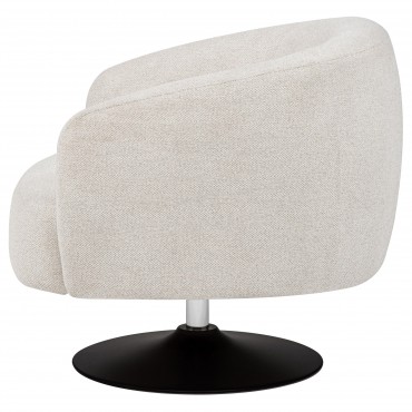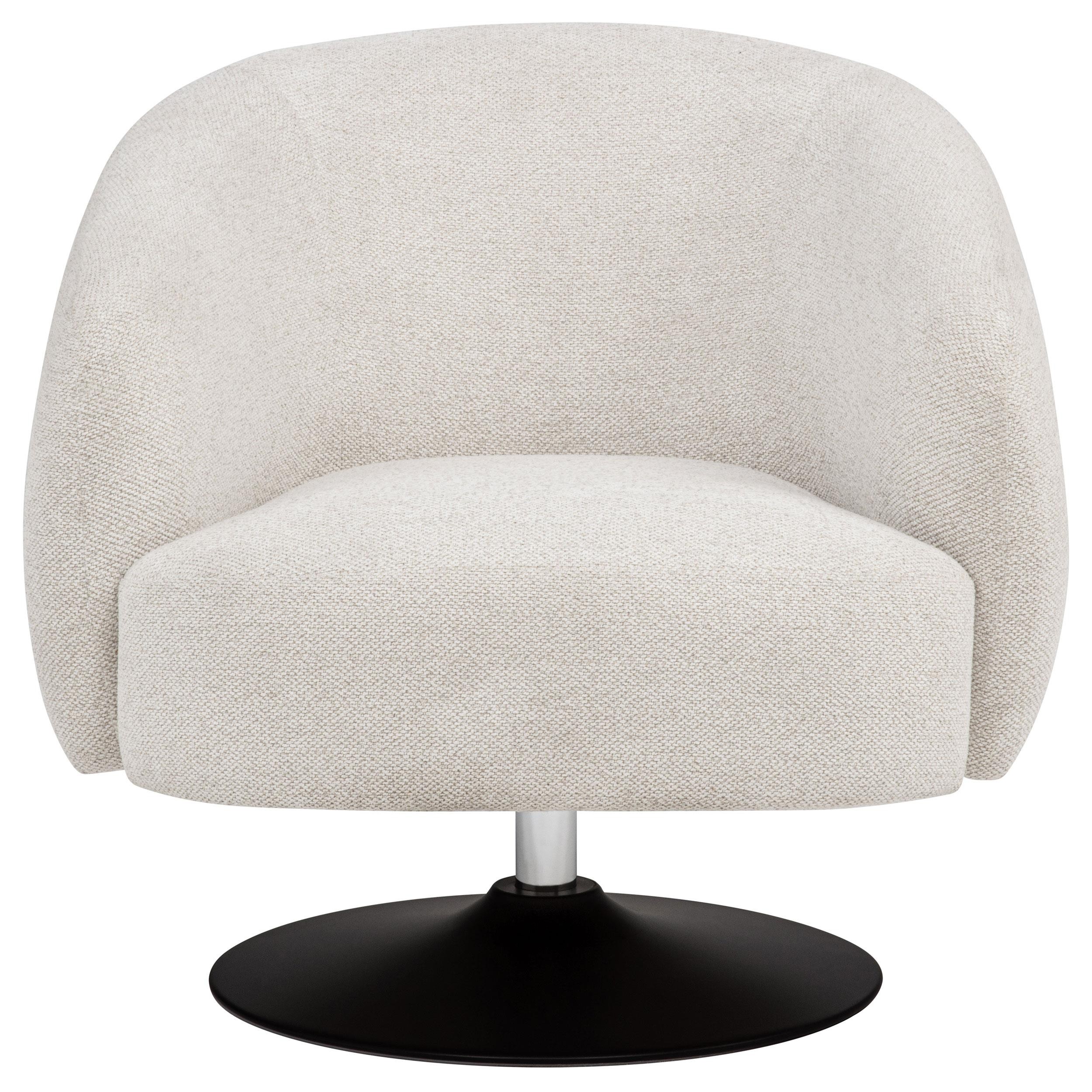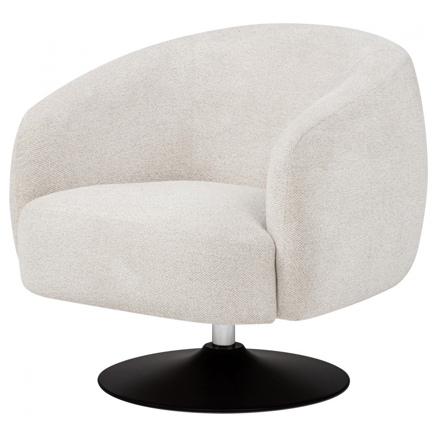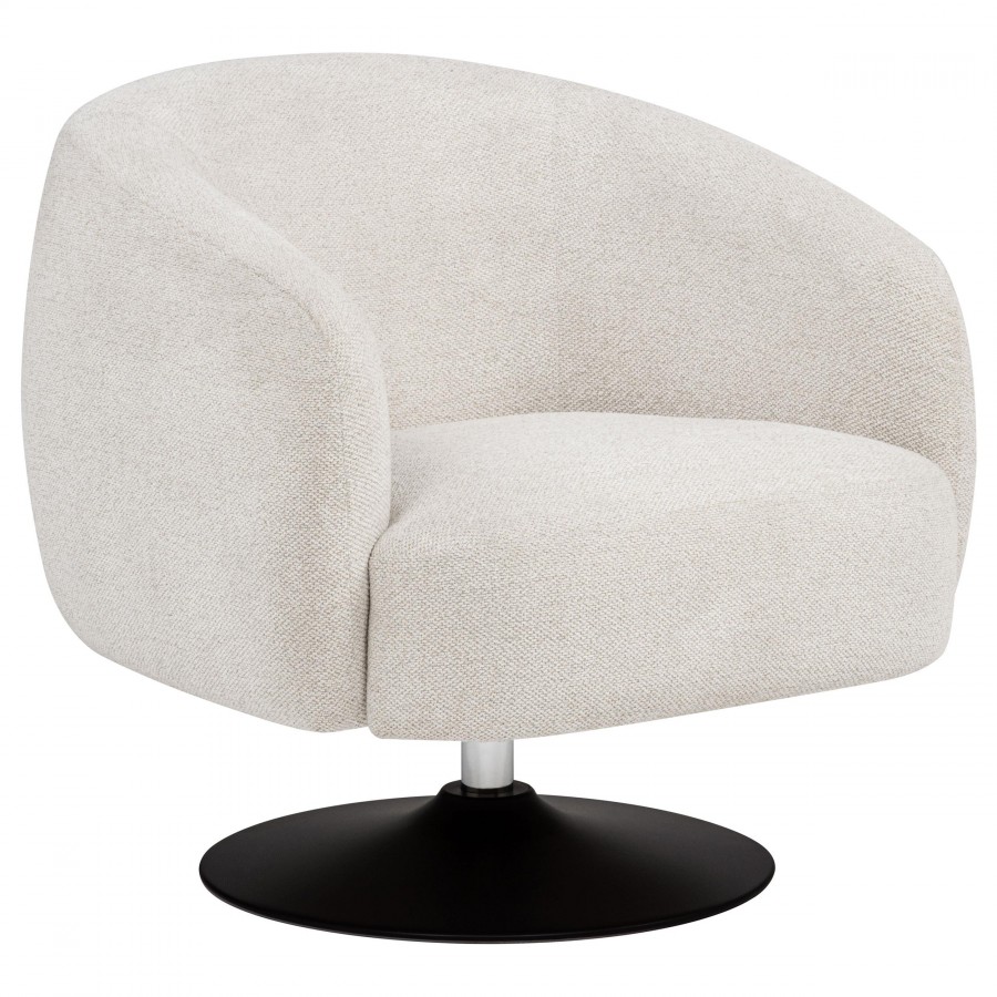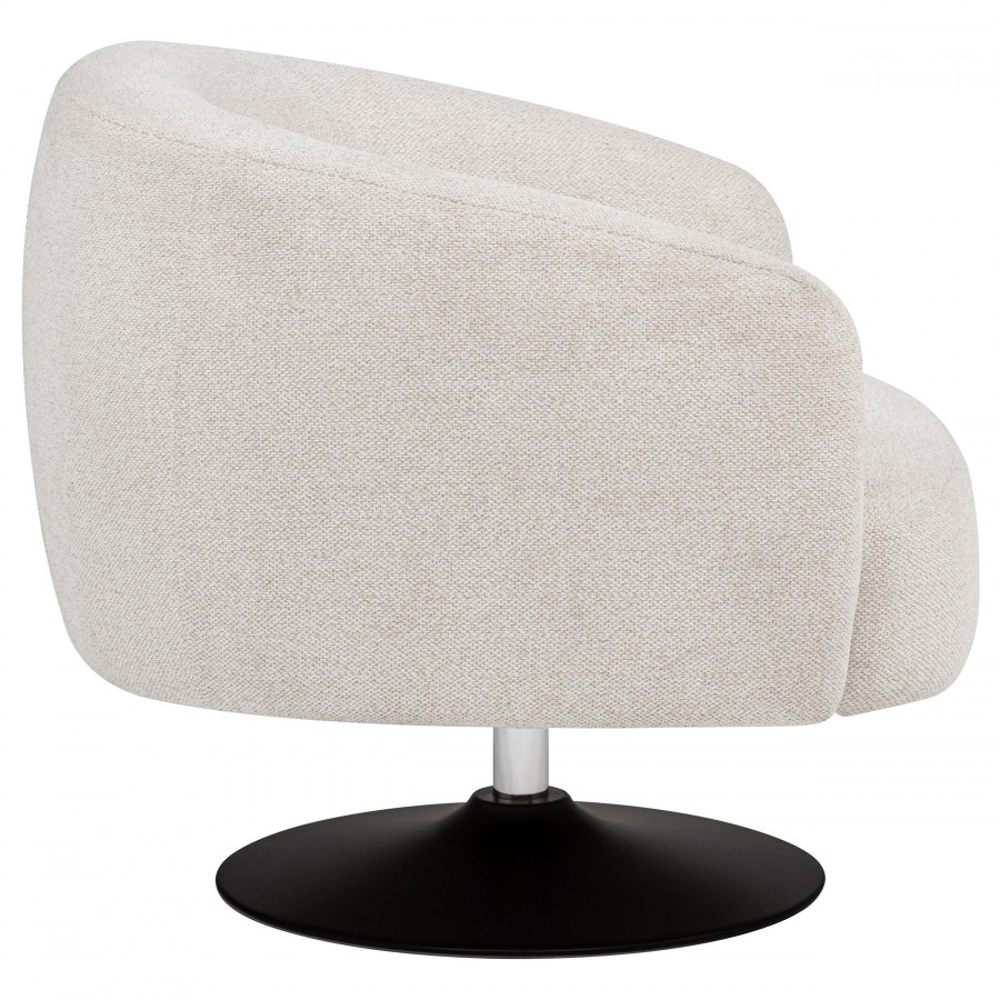Elevate your seating area with this stylish swivel accent chair that blends modern sophistication with retro charm. Wrapped in soft beige boucle fabric, it offers a tactile texture and inviting comfort. The barrel-back silhouette features a tailored seat and gently curved arms for a clean, contemporary look. Supported by a matte black pedestal base, the chair rotates a full 360 degrees for effortless movement. Perfect for a living room or reading nook, it combines comfort, versatility, and modern flair.
