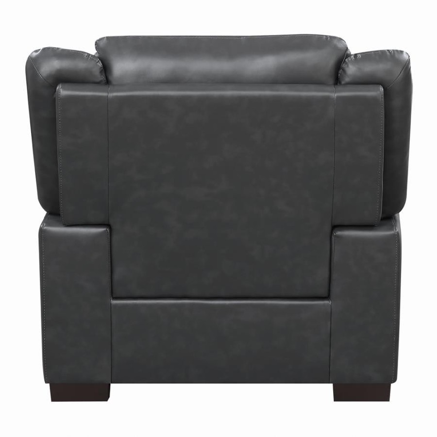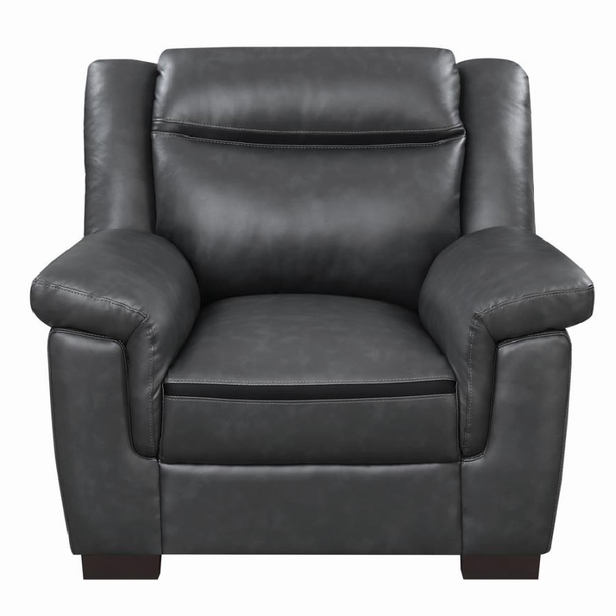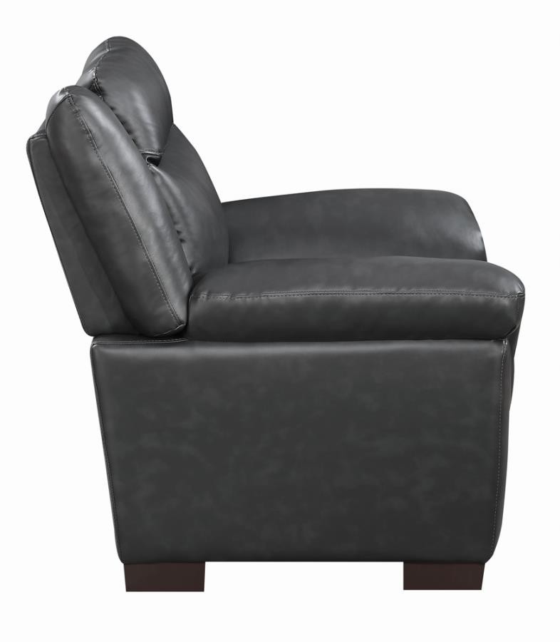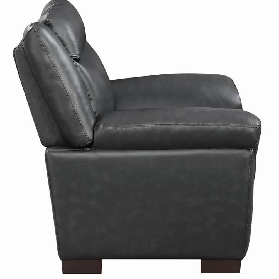 Bring modern comfort and sophistication to your seating area with this contemporary armchair. Upholstered in smooth grey leatherette with detailed stitching, it offers a clean, refined look. Generously padded seating and plush pillow-top arms provide exceptional comfort, while the high back delivers excellent support. Its sturdy wooden frame and dark brown block-style legs add lasting stability and a touch of contrast. Compact and stylish, this chair enhances any living room or lounge space with its modern design and inviting appeal.